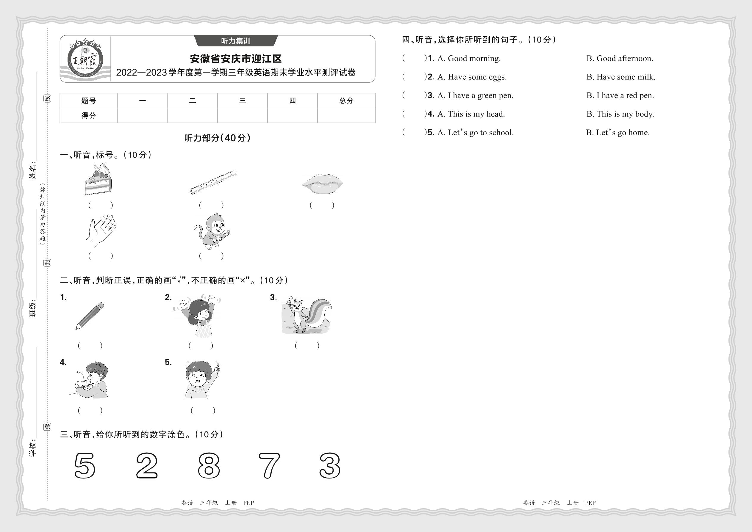 【听力集训】安徽省安庆市迎江区2022—2023学年度第一学期三年级英语期末学业水平测评试卷(人教PEP版)