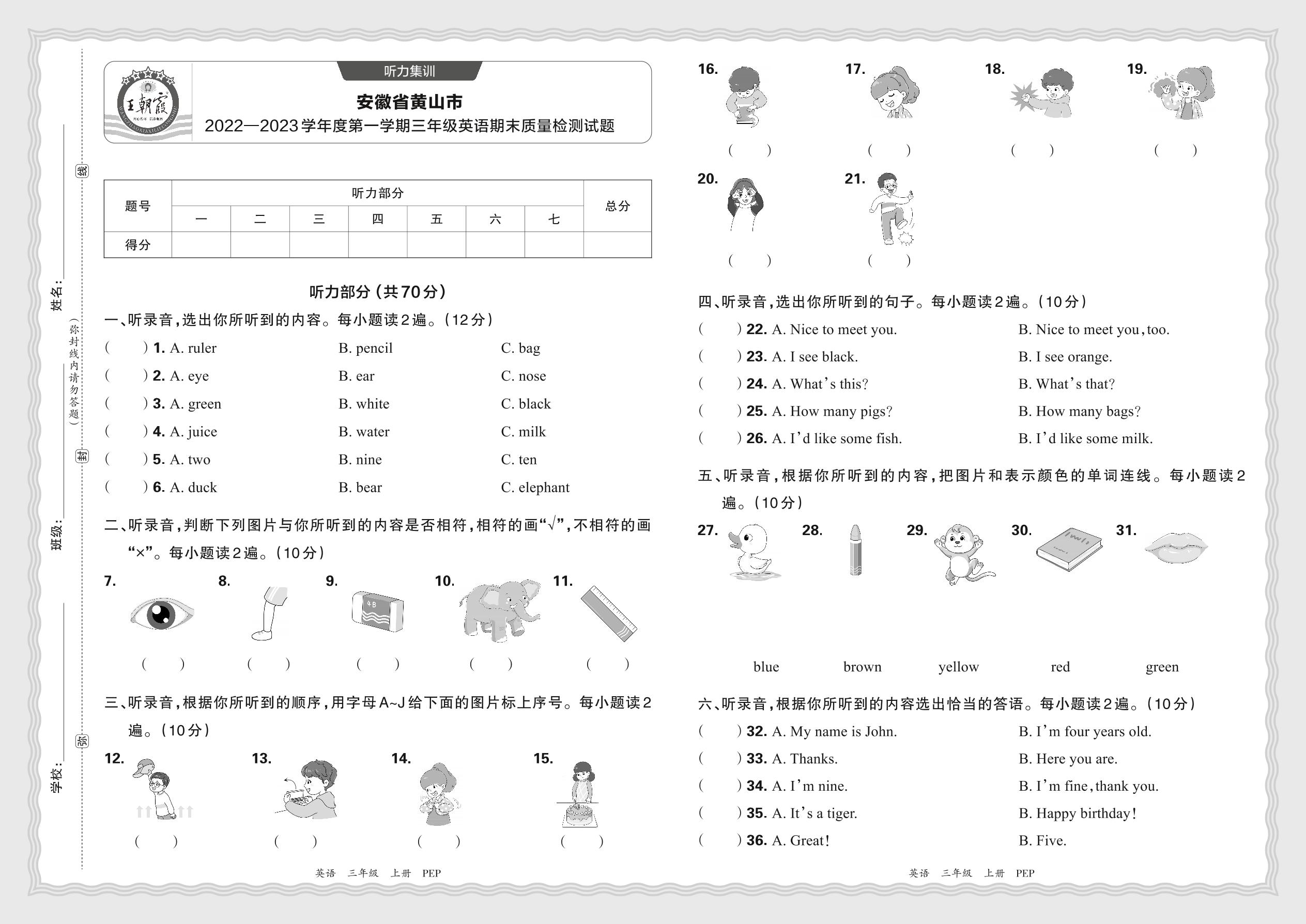 【听力集训】安徽省黄山市2022—2023学年度第一学期三年级英语期末质量检测试题(人教PEP版)