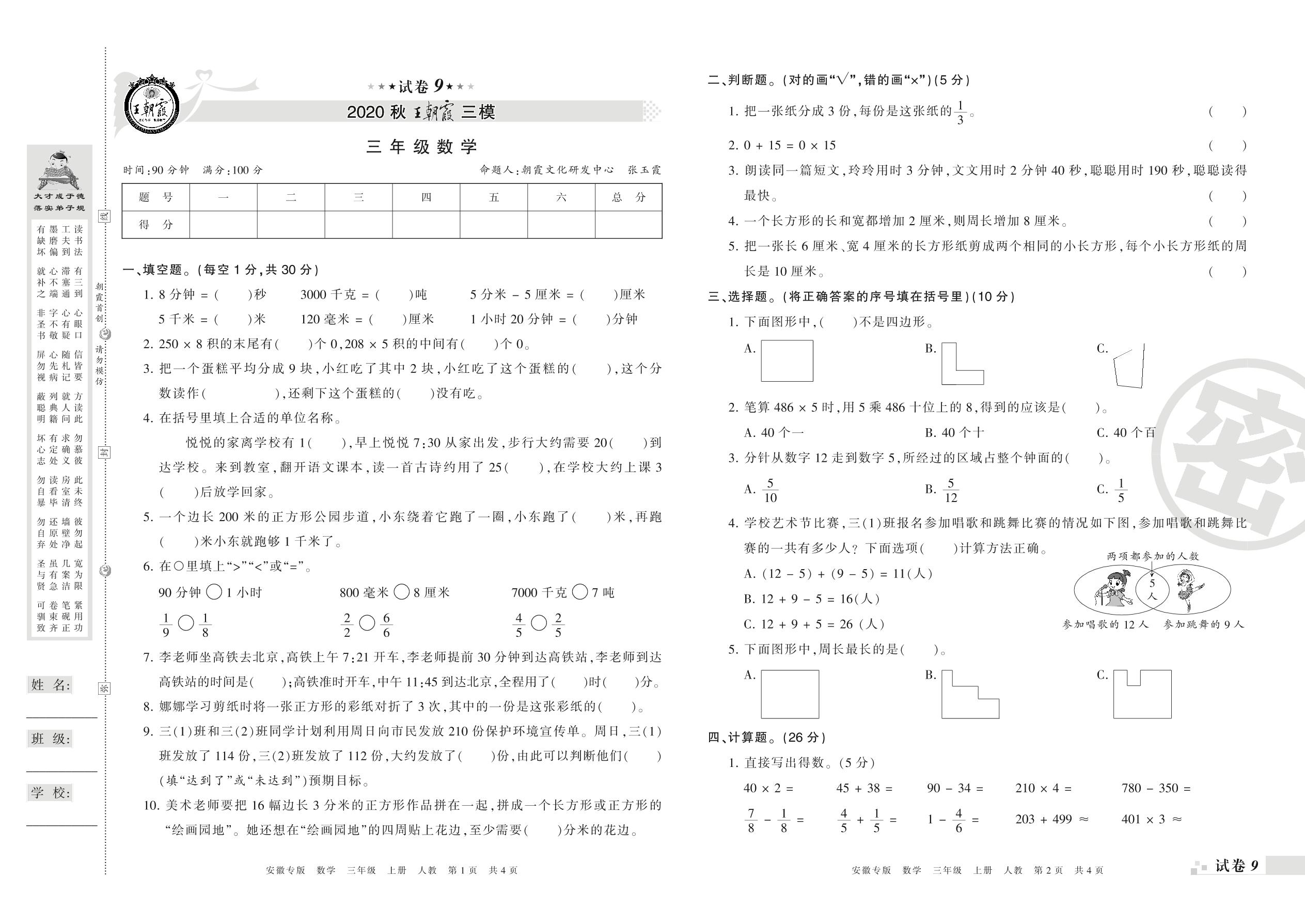 王朝霞期末模拟卷三年级上册数学(人教版)_R21080491930【9】