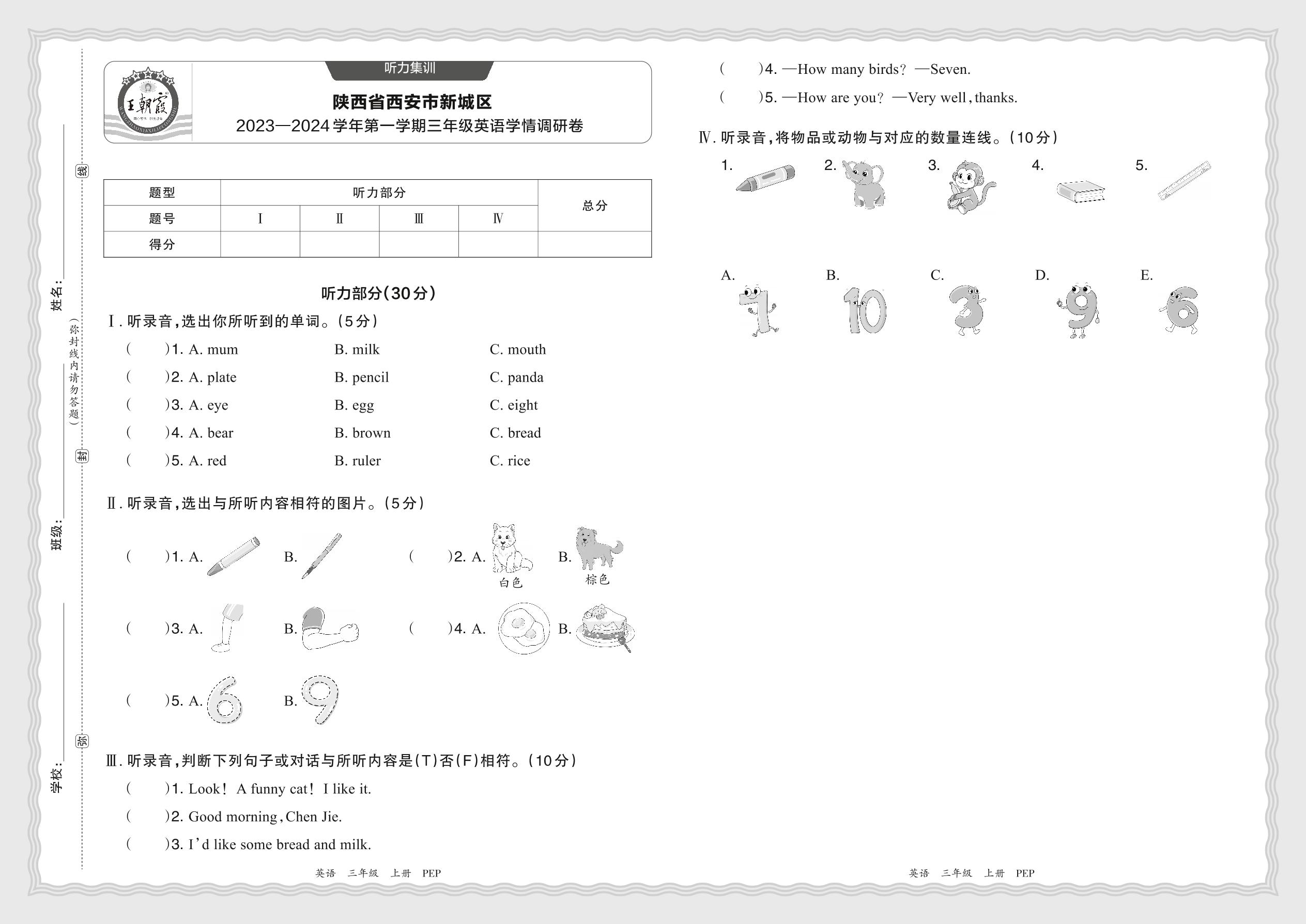 【听力集训】陕西省西安市新城区2023—2024学年第一学期三年级英语学情调研卷(人教PEP版)