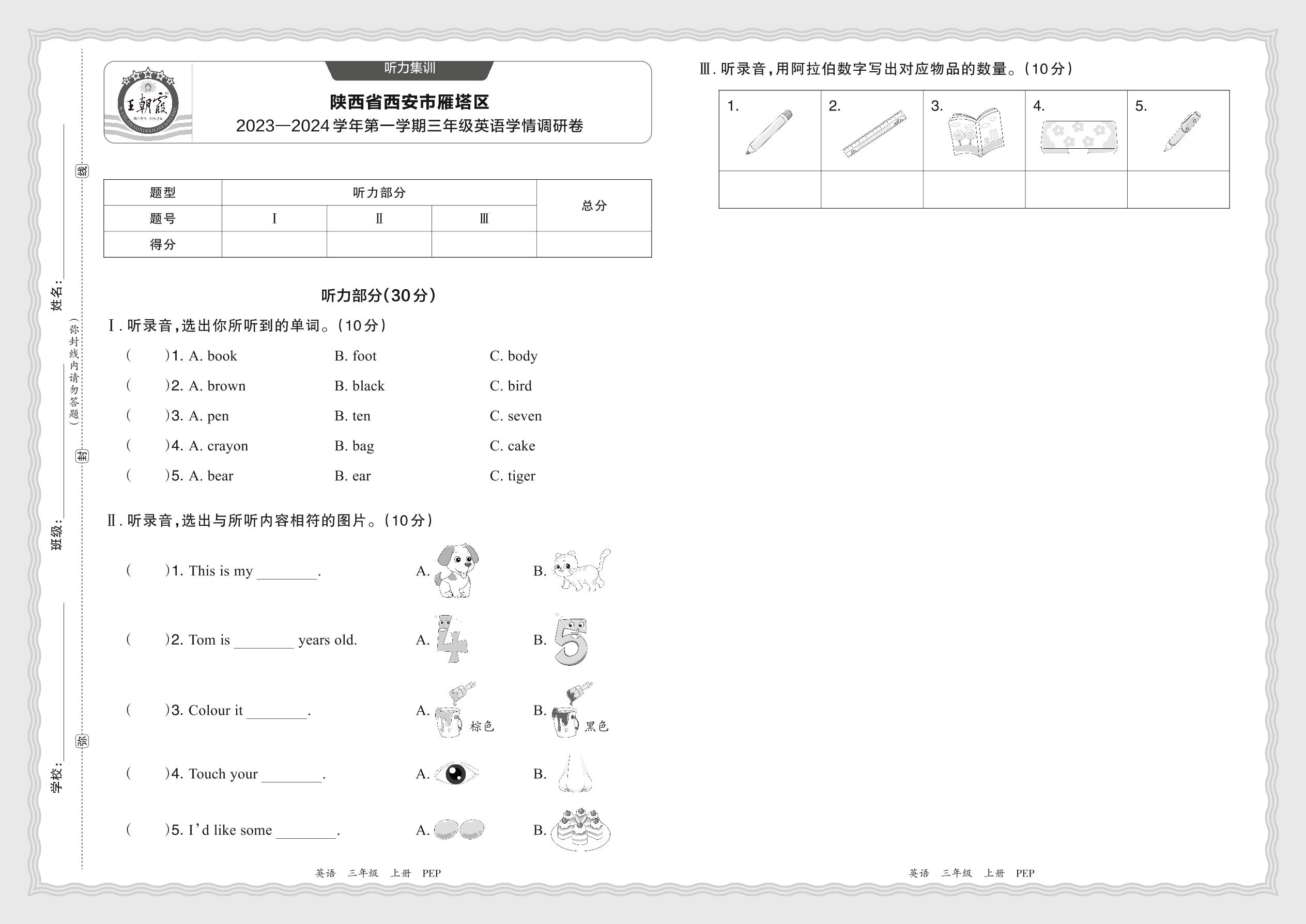 【听力集训】陕西省西安市雁塔区2023—2024学年第一学期三年级英语学情调研卷(人教PEP版)