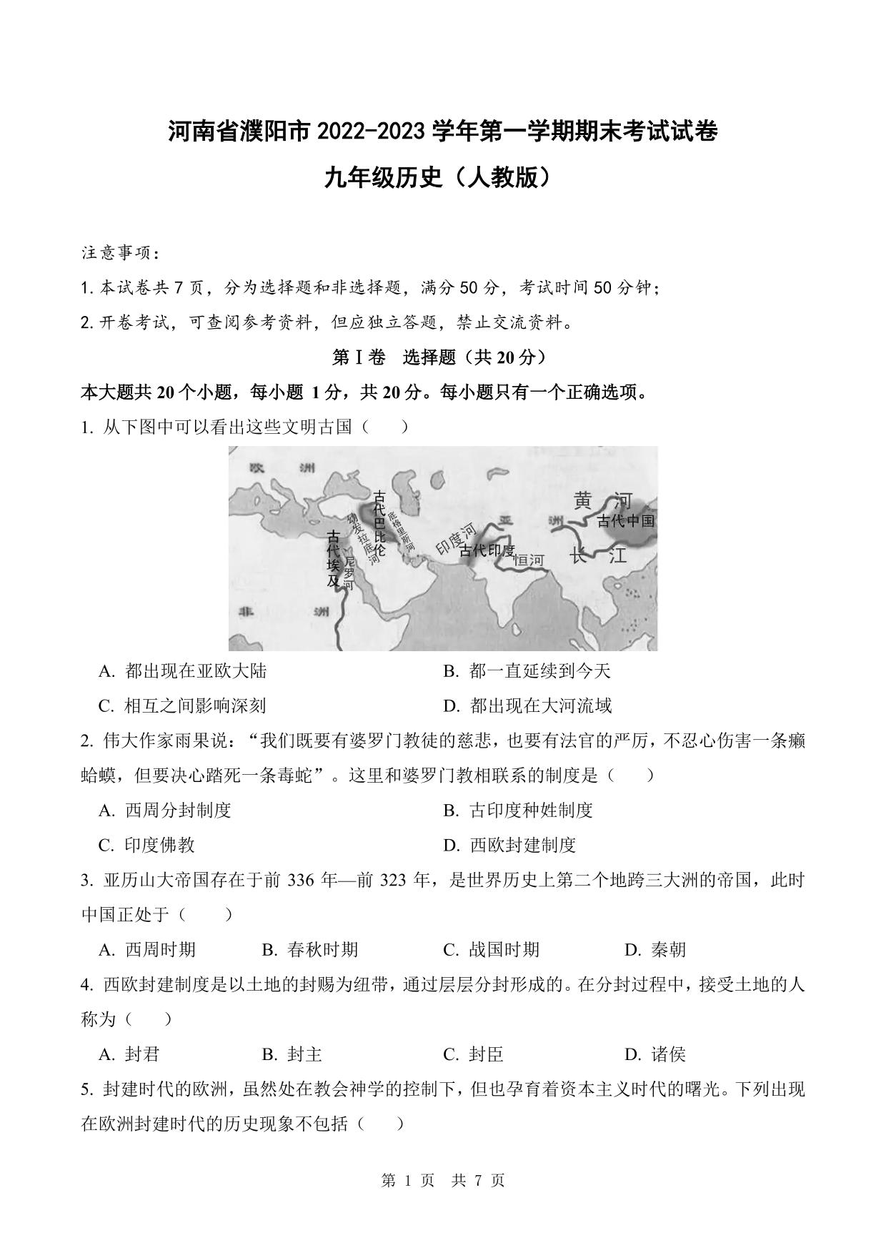 河南省濮阳市2022-2023学年第一学期期末考试试卷九年级历史(人教版)