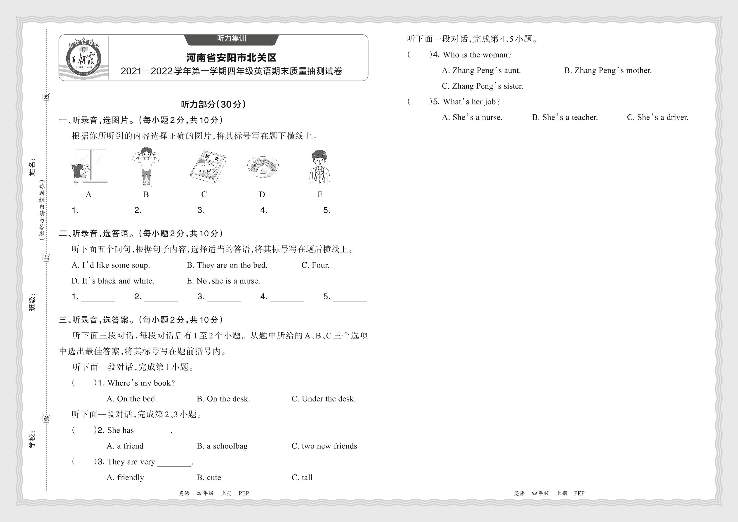 【听力集训】河南省安阳市北关区2021—2022学年第一学期四年级英语期末试题(人教PEP版)