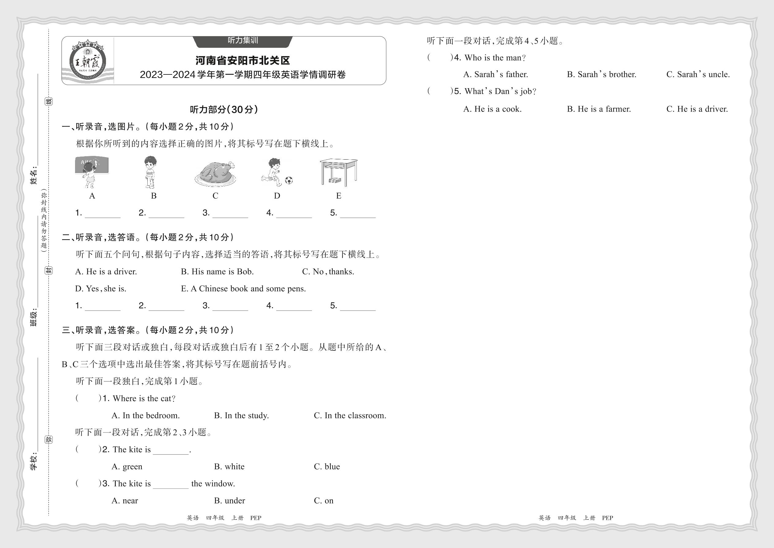 【听力集训】河南省安阳市北关区2023—2024学年第一学期四年级英语学情调研卷(人教PEP版)