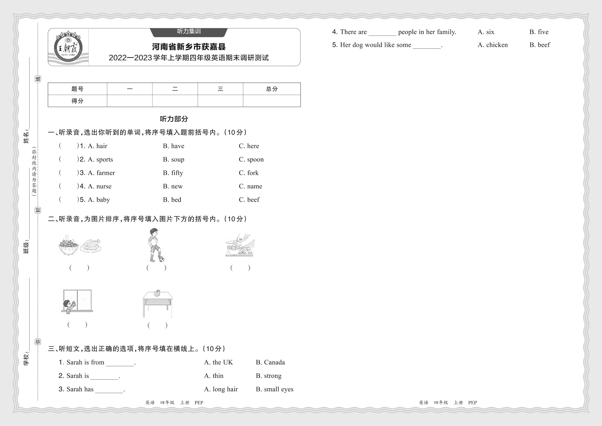 【听力集训】河南省新乡市获嘉县2022—2023学年上学期四年级英语期末调研测试(人教PEP版)