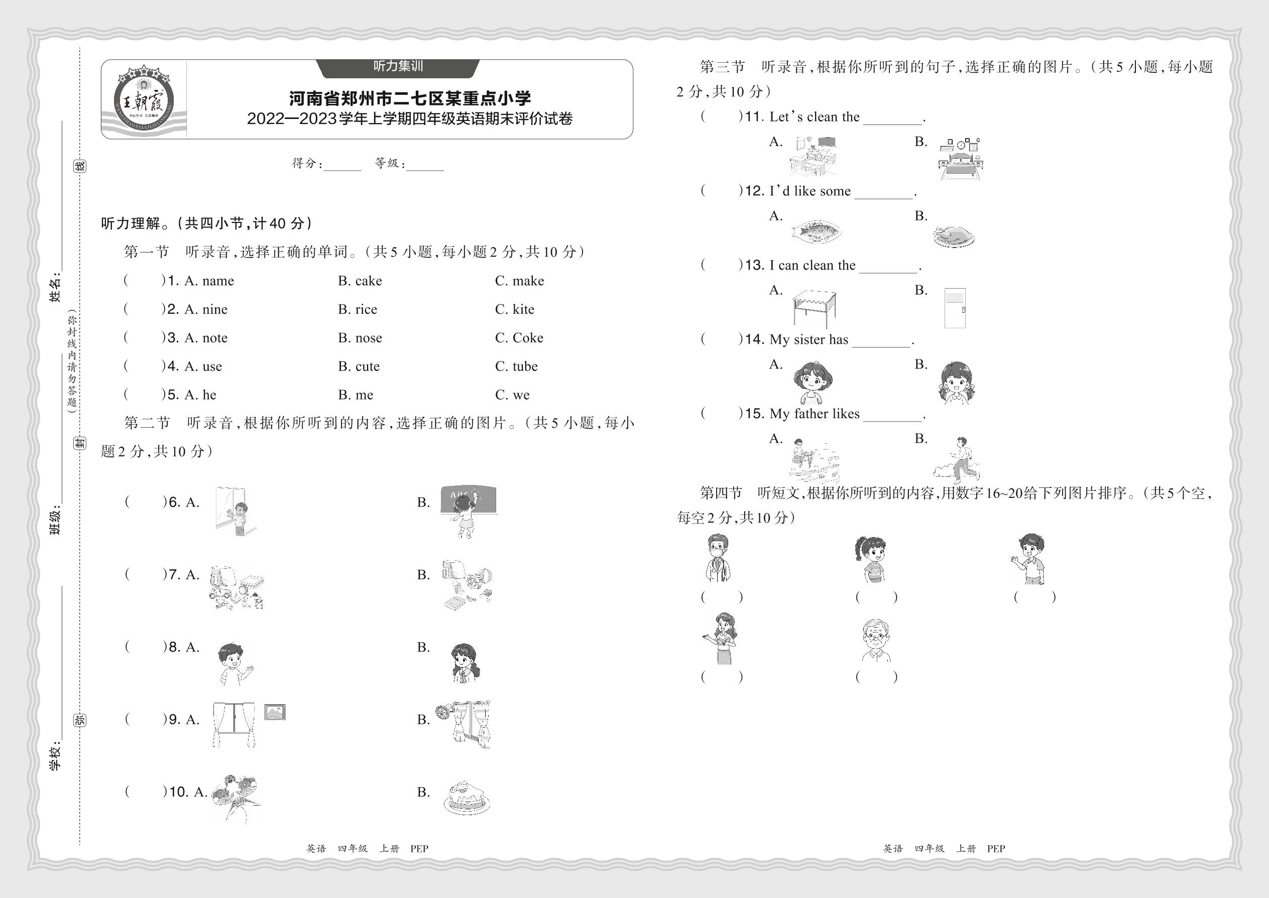 【听力集训】河南省郑州市二七区某重点小学2022—2023学年上学期四年级英语期末评价试卷(人教PEP版)