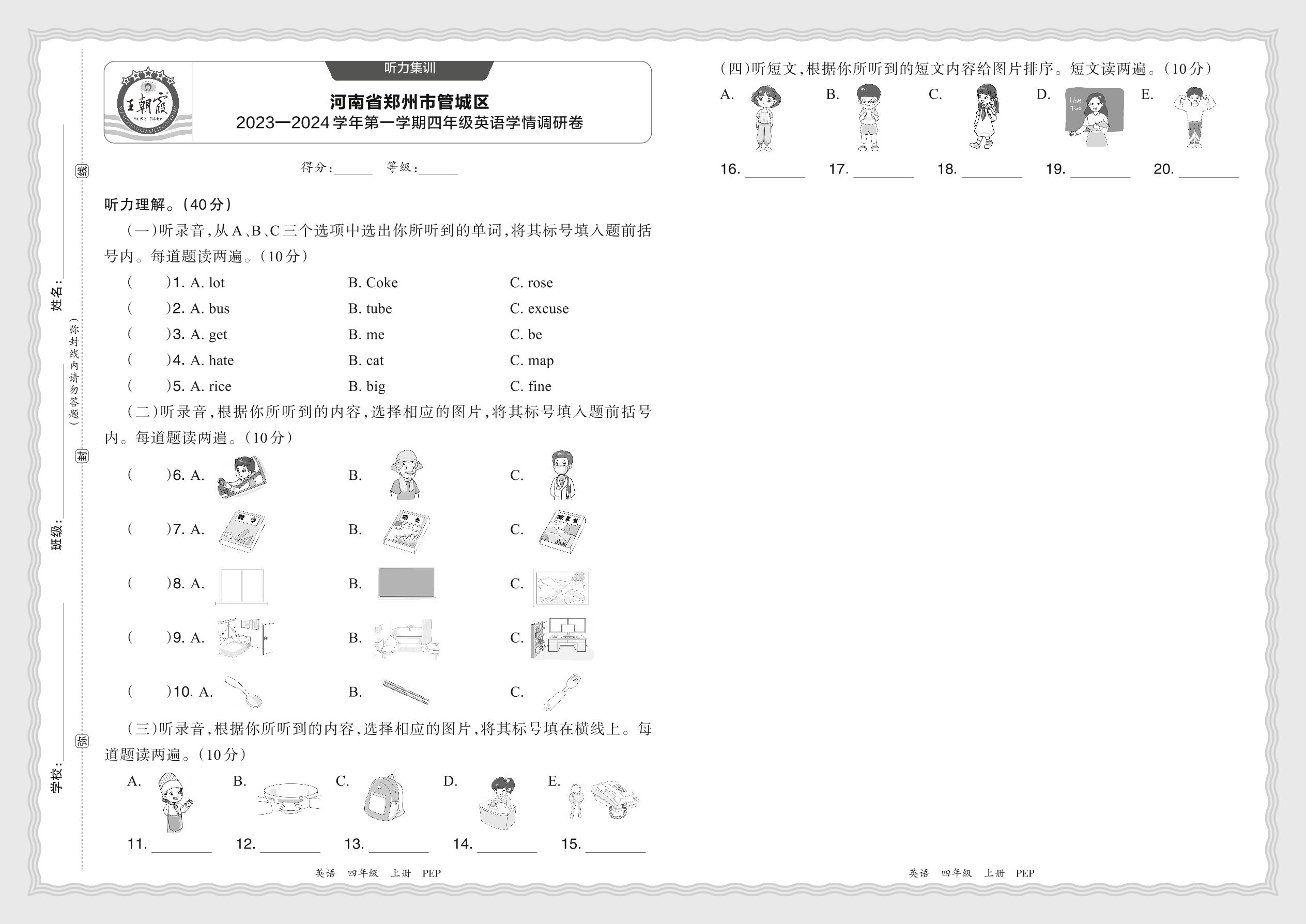 【听力集训】河南省郑州市管城区2023—2024学年第一学期四年级英语学情调研卷(人教PEP版)