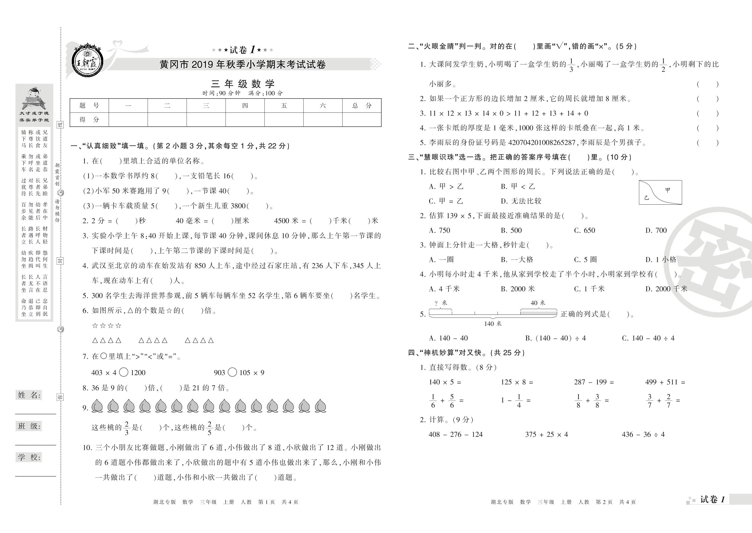 2019-2020学年第一学期黄冈市三年级数学试卷(人教版)【1】