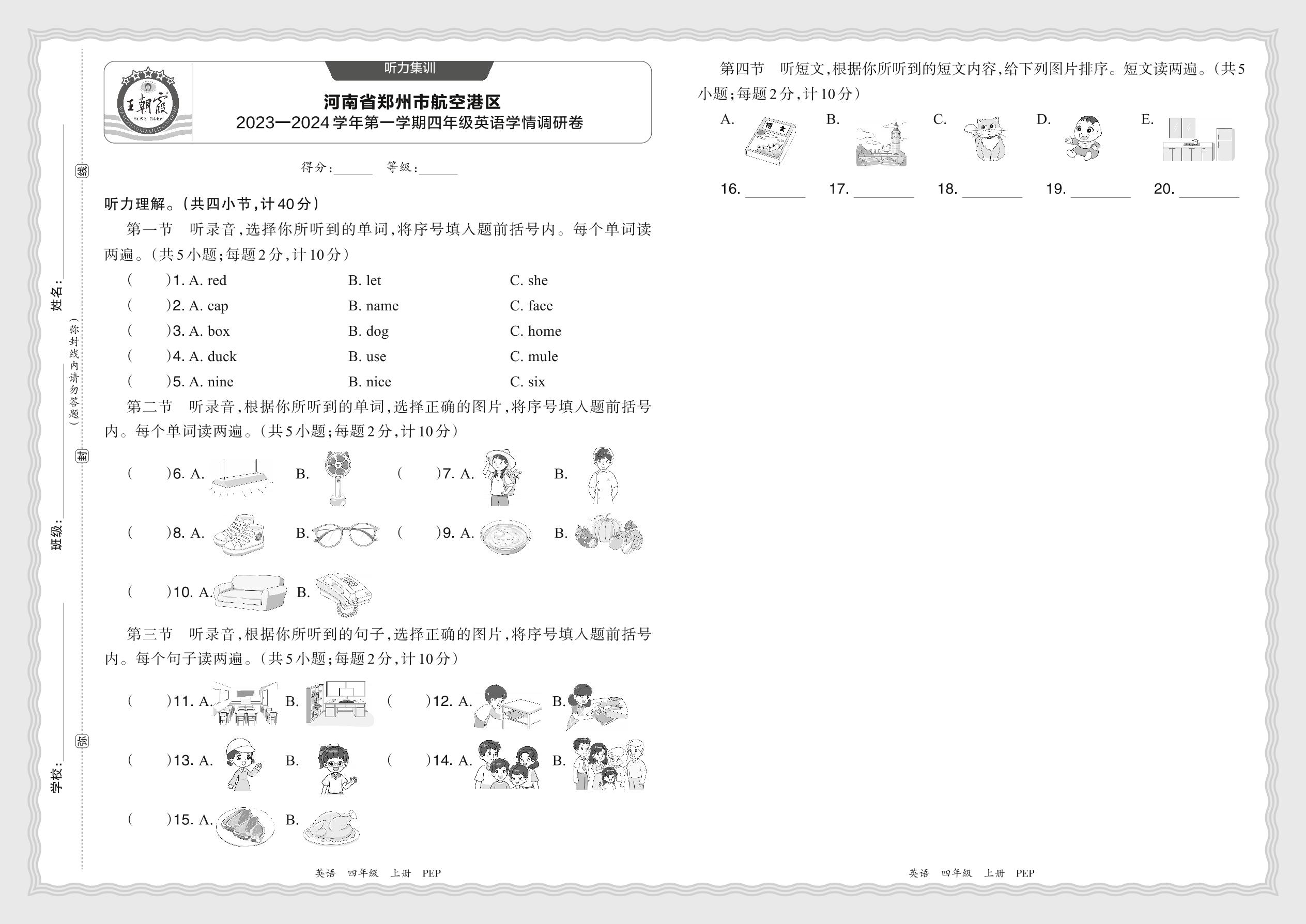 【听力集训】河南省郑州市航空港区2023—2024学年第一学期四年级英语学情调研卷(人教PEP版)