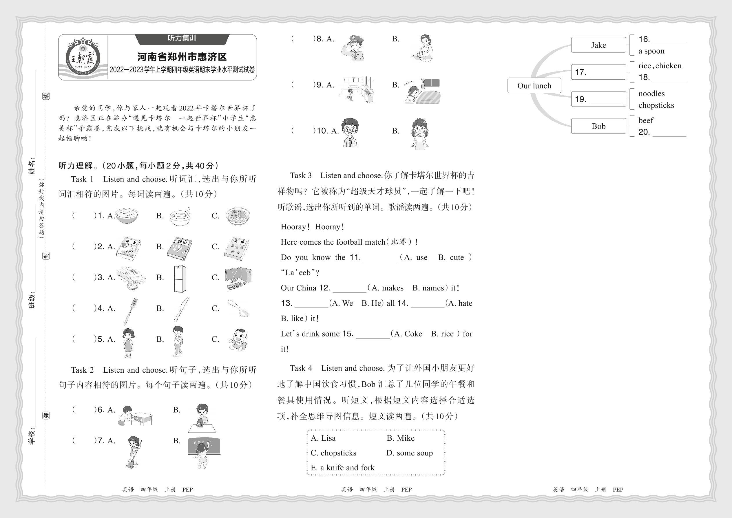 【听力集训】河南省郑州市惠济区2022—2023学年上学期四年级英语期末学业水平测试试卷(人教PEP版)