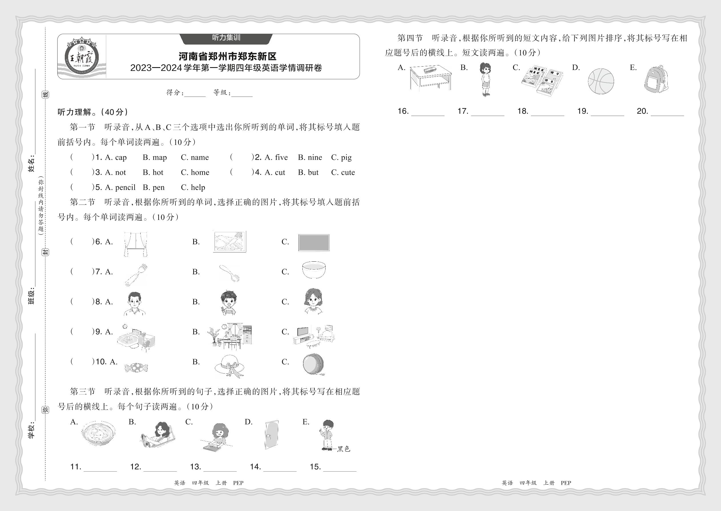 【听力集训】河南省郑州市郑东新区2023—2024学年第一学期四年级英语学情调研卷(人教PEP版)