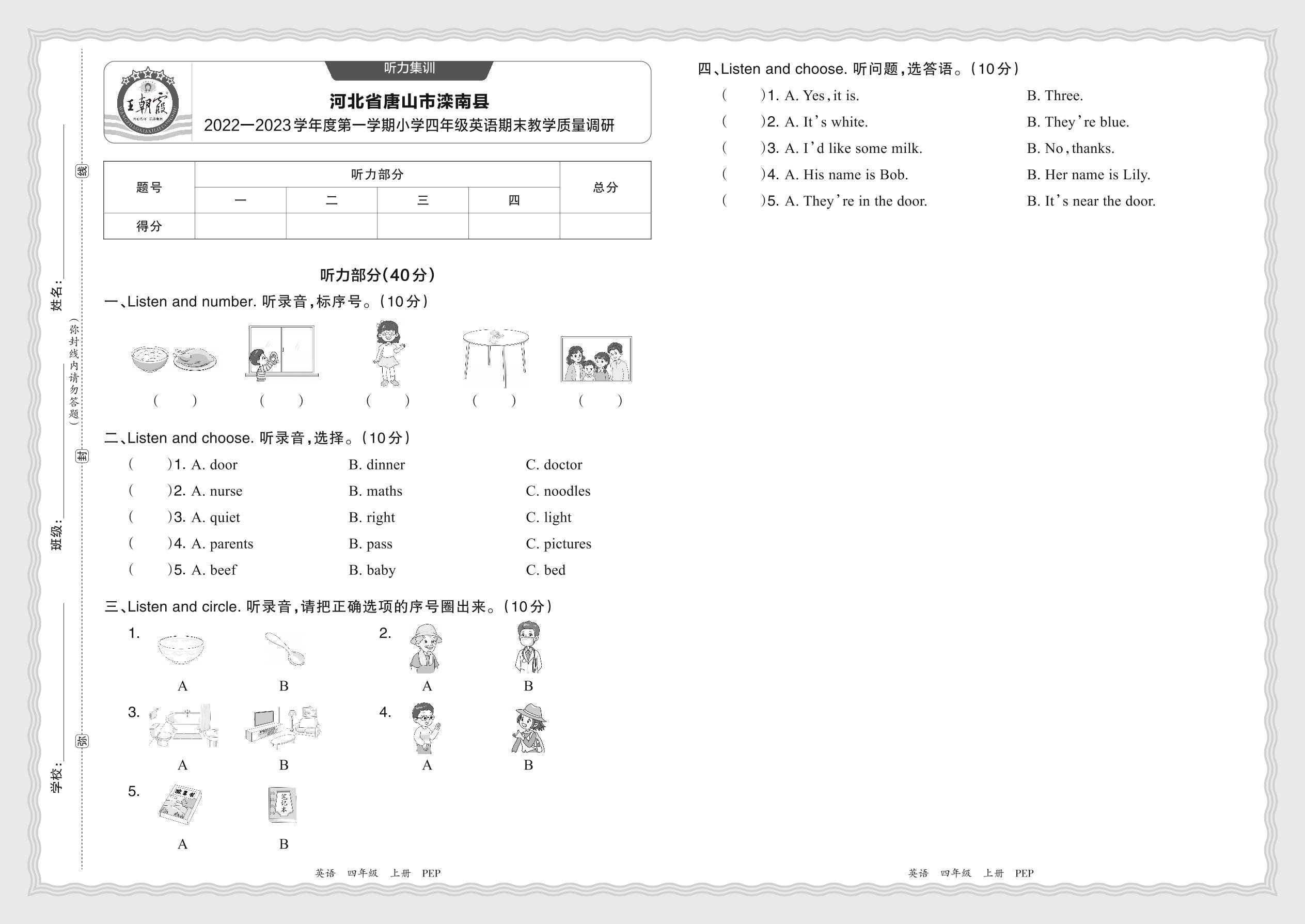 【听力集训】河北省唐山市滦南县2022—2023学年第一学期小学四年级英语期末教学质量调研(人教PEP版)