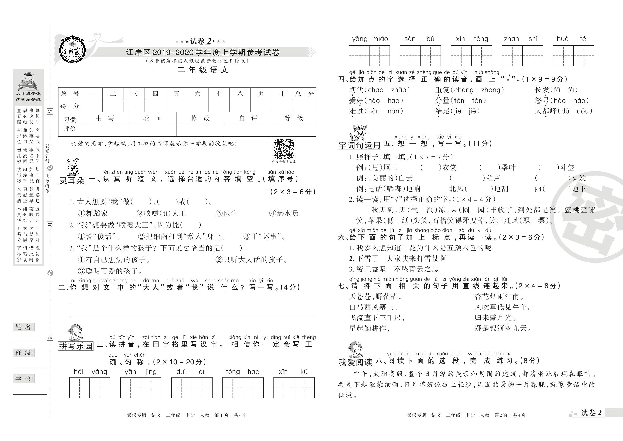 2019-2020学年第一学期武汉市江岸区二年级语文试卷(人教版)【2】