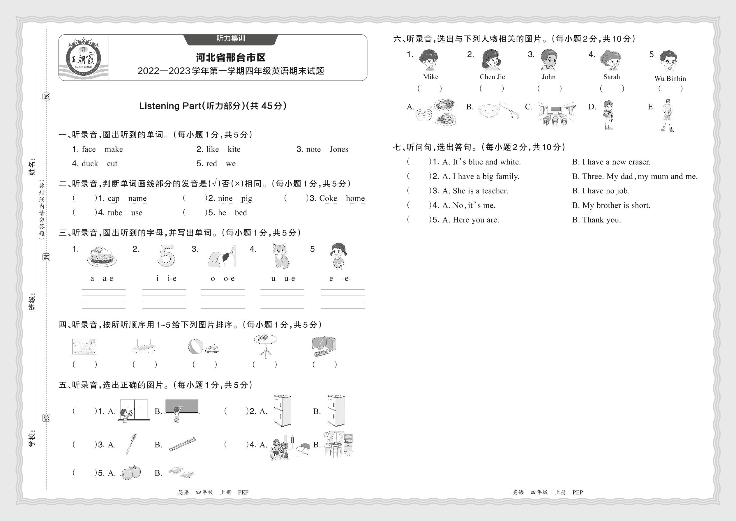 【听力集训】河北省邢台市区2022—2023学年第一学期四年级英语期末试题(人教PEP版)