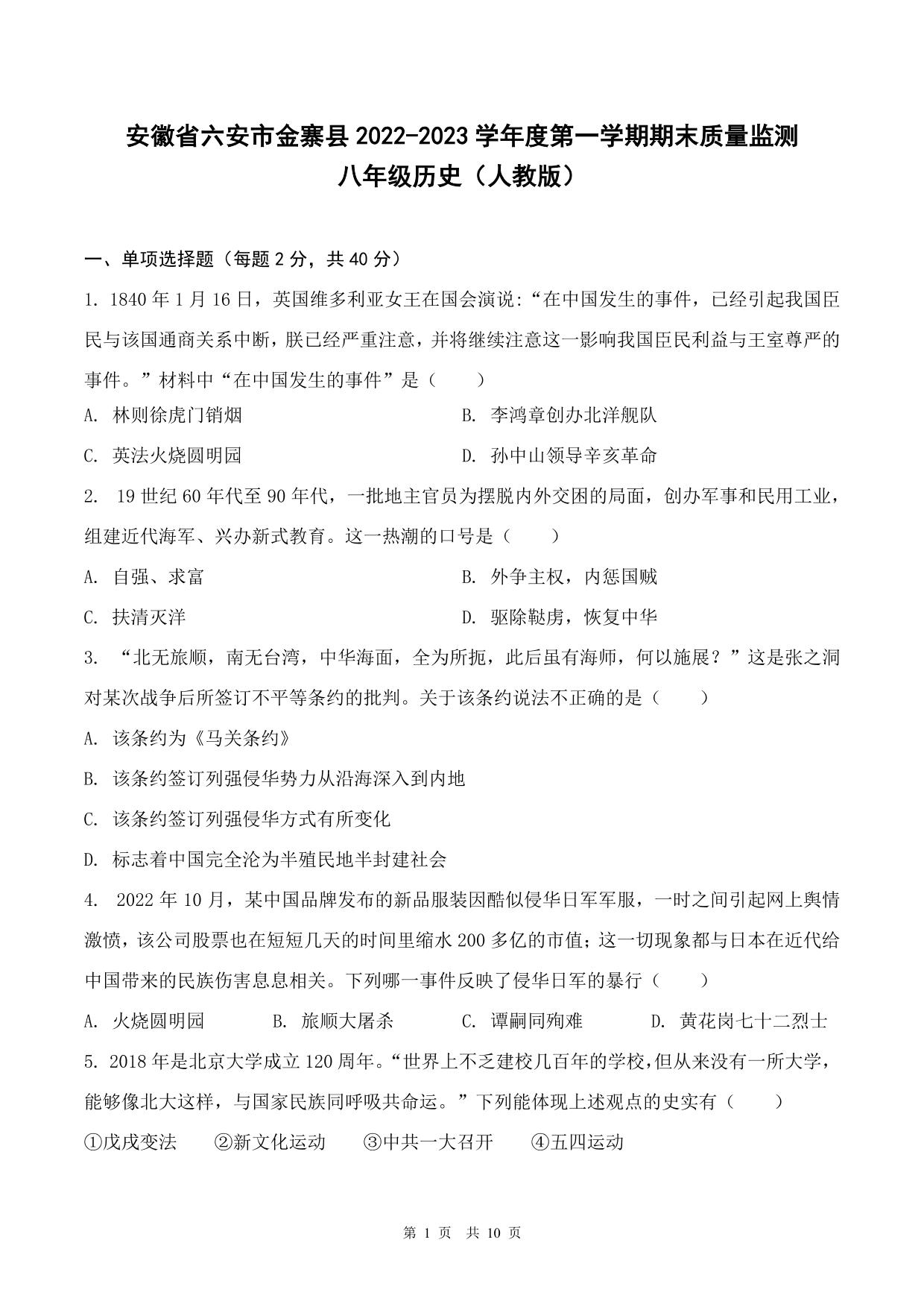 安徽省六安市金寨县2022-2023学年度第一学期期末质量监测八年级历史(人教版)