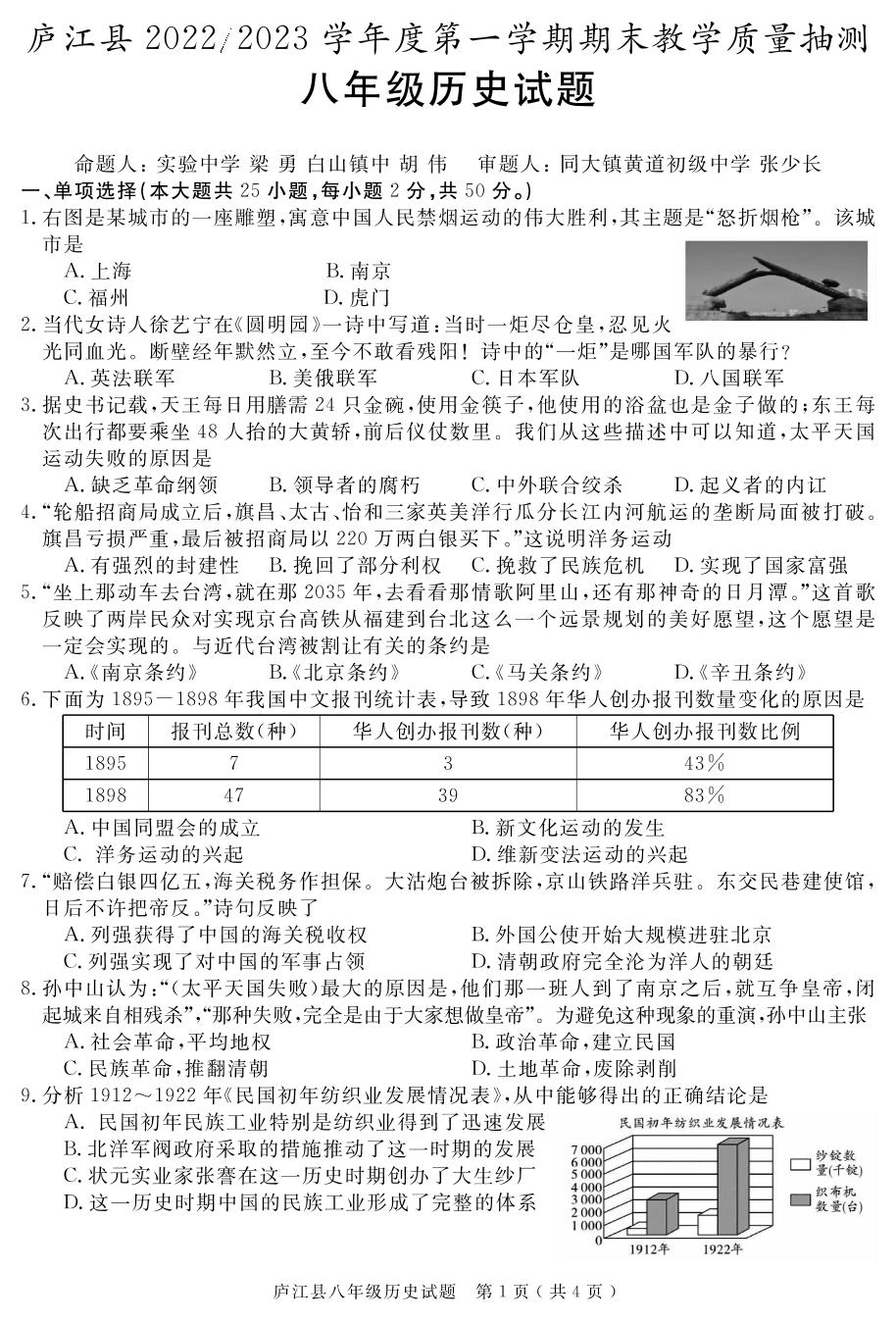 安徽省合肥市庐江县2022-2023学年度第一学期期末教学质量抽测八年级历史(人教版)
