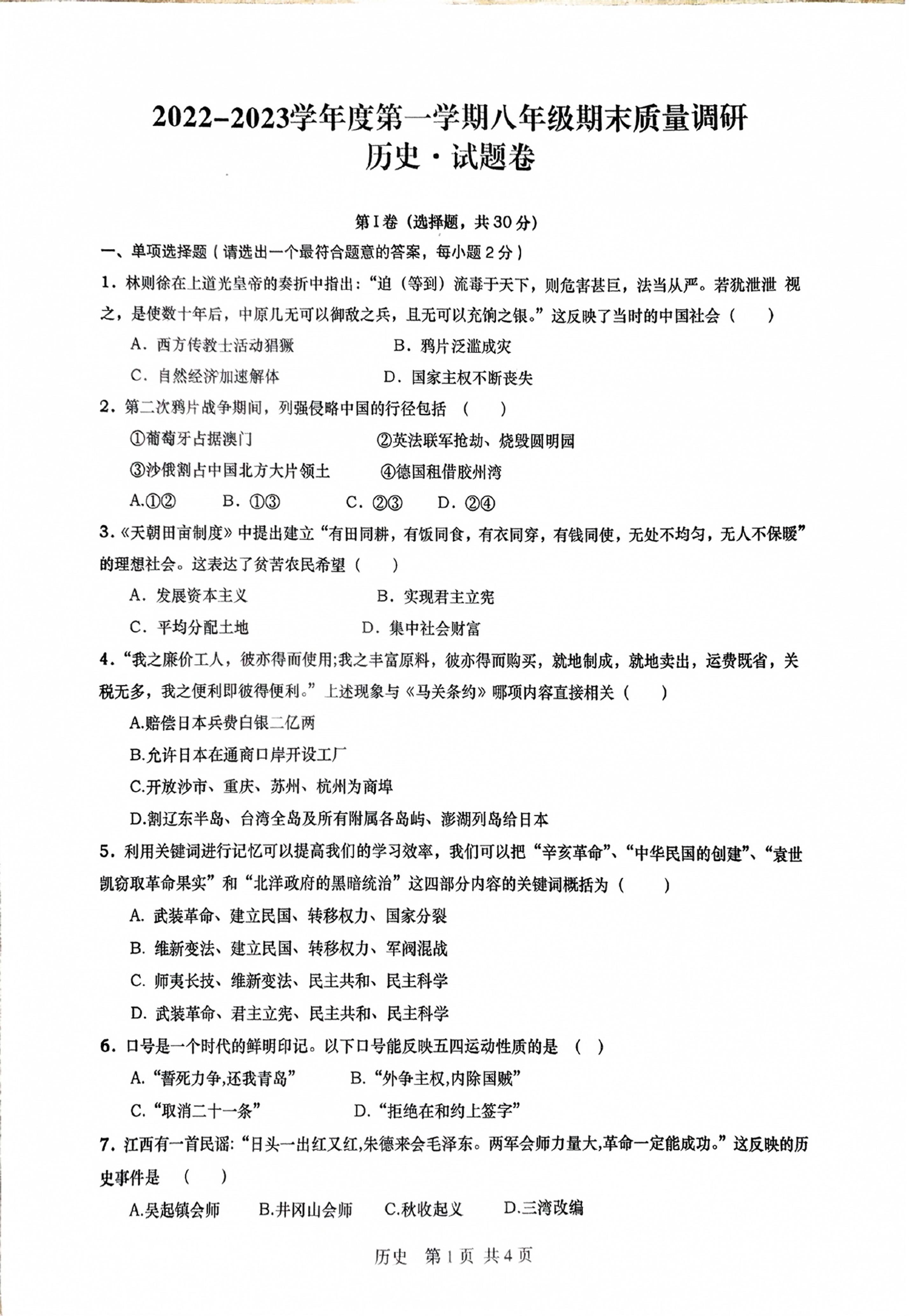 安徽省淮南市寿县2022-2023学年度第一学期期末质量调研八年级历史(人教版)