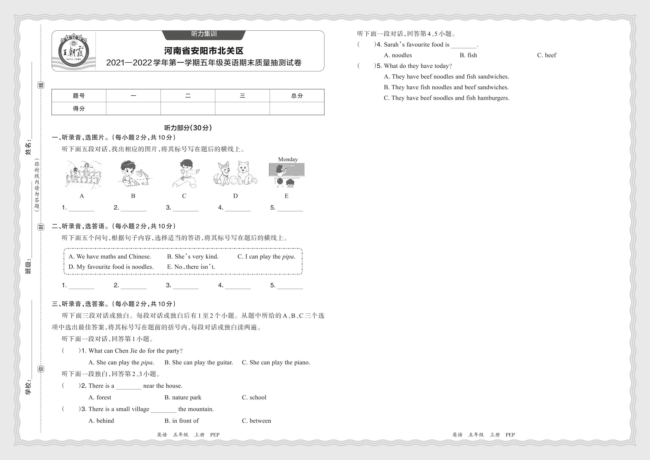 【听力集训】河南省安阳市北关区2021—2022学年第一学期五年级英语期末质量抽测试卷(人教PEP版)