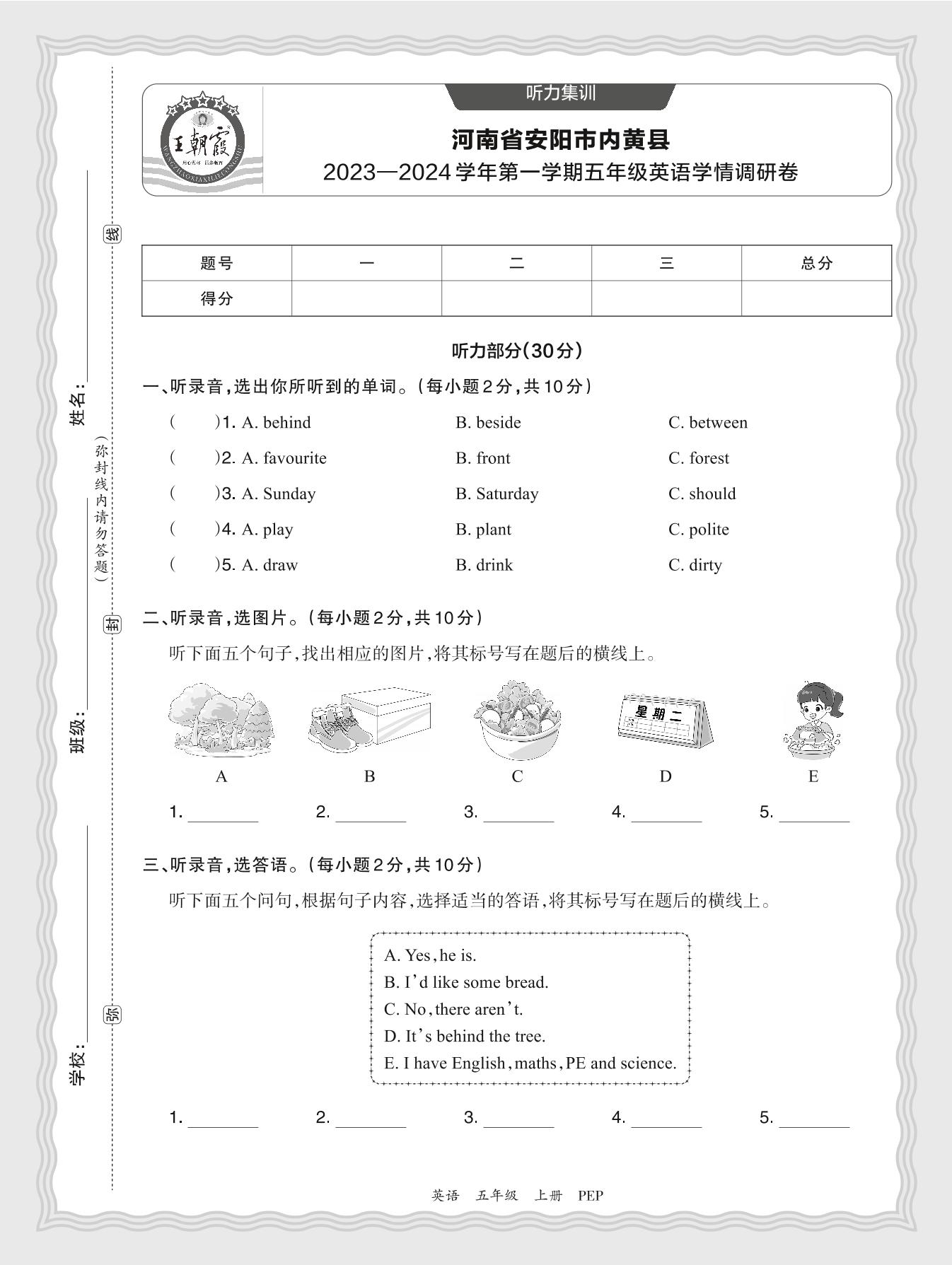 【听力集训】河南省安阳市内黄县2023—2024学年第一学期五年级英语学情调研卷(人教PEP版)
