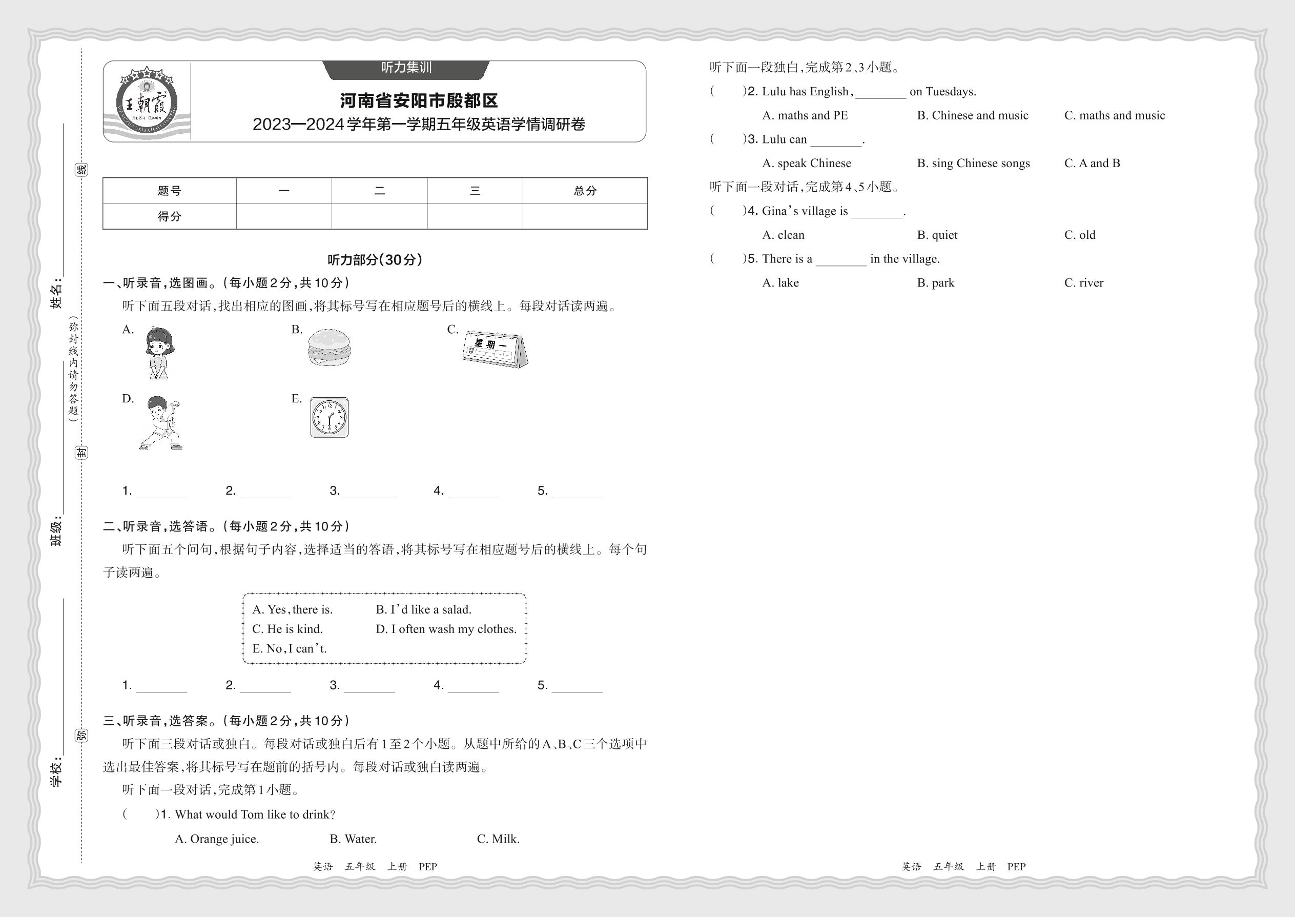 【听力集训】河南省安阳市殷都区2023—2024学年第一学期五年级英语学情调研卷(人教PEP版)