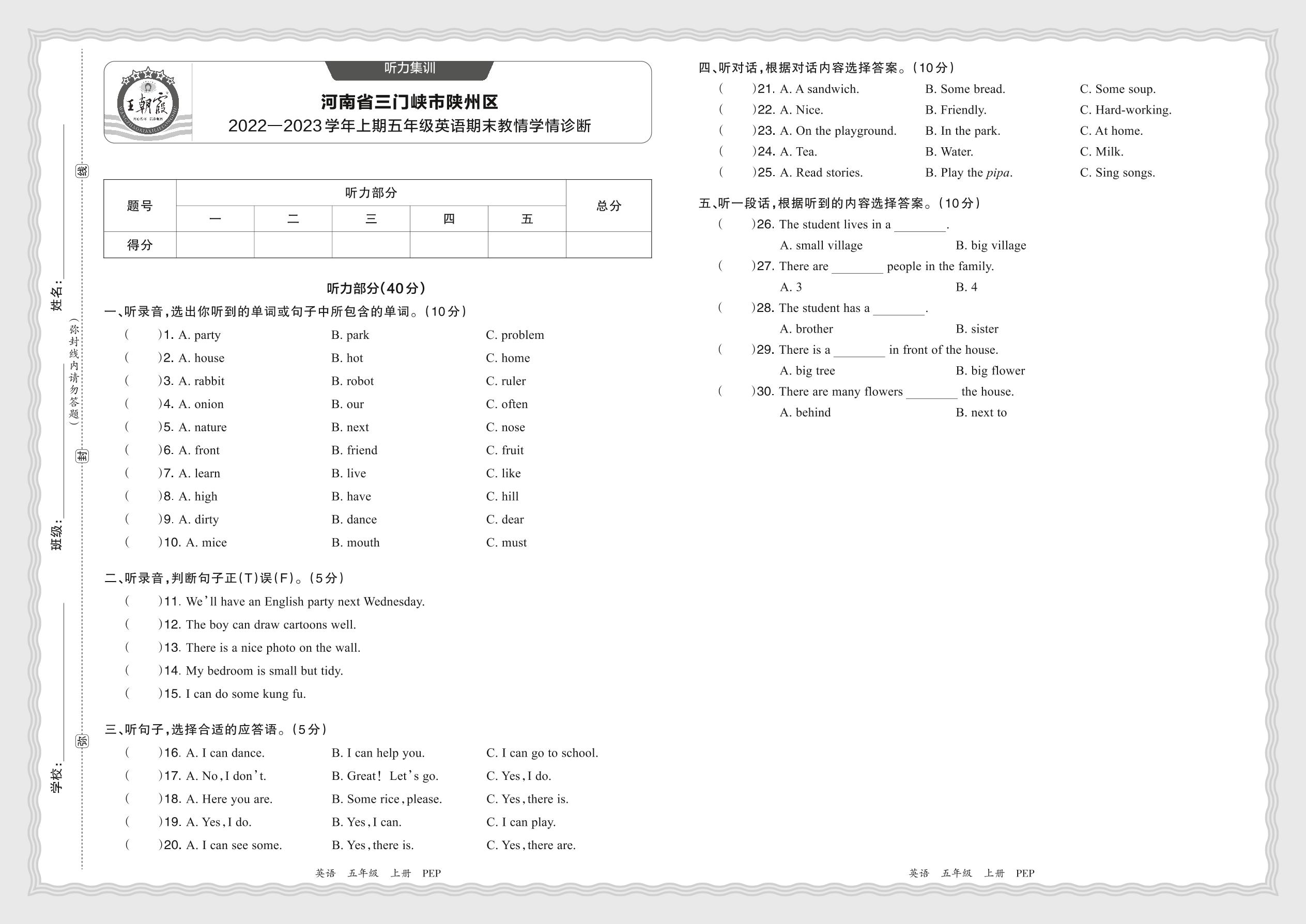 【听力集训】河南省三门峡市陕州区2022—2023学年上期五年级英语期末教情学情诊断(人教PEP版)