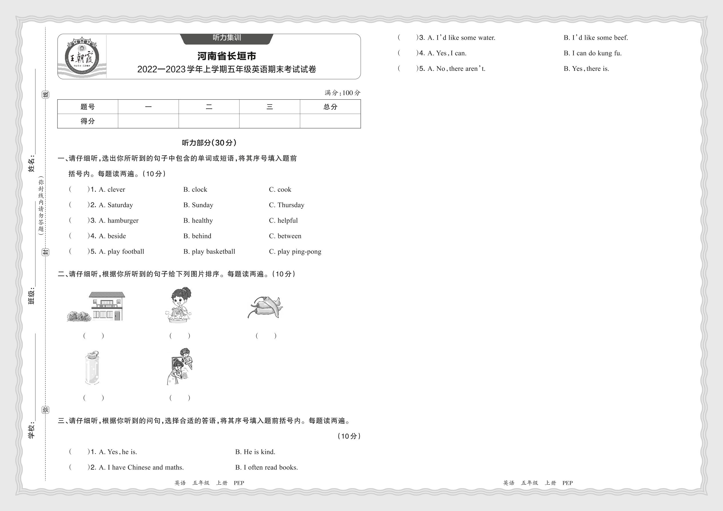 【听力集训】河南省新乡市长垣市2022—2023学年上学期五年级英语期末考试试卷(人教PEP版)