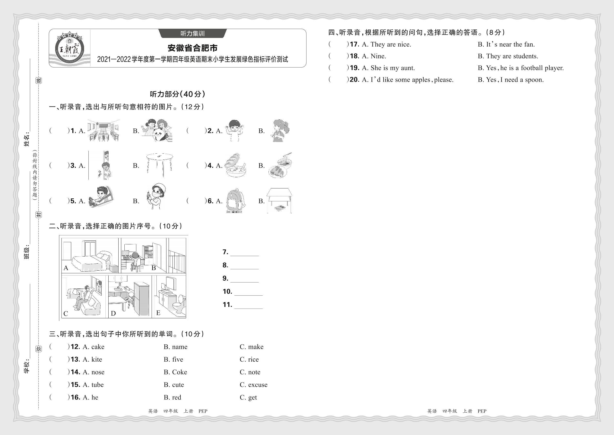 【听力集训】安徽省合肥市2021—2022学年度第一学期四年级英语期末发展绿色指标评价测试试题卷(人教PEP版)