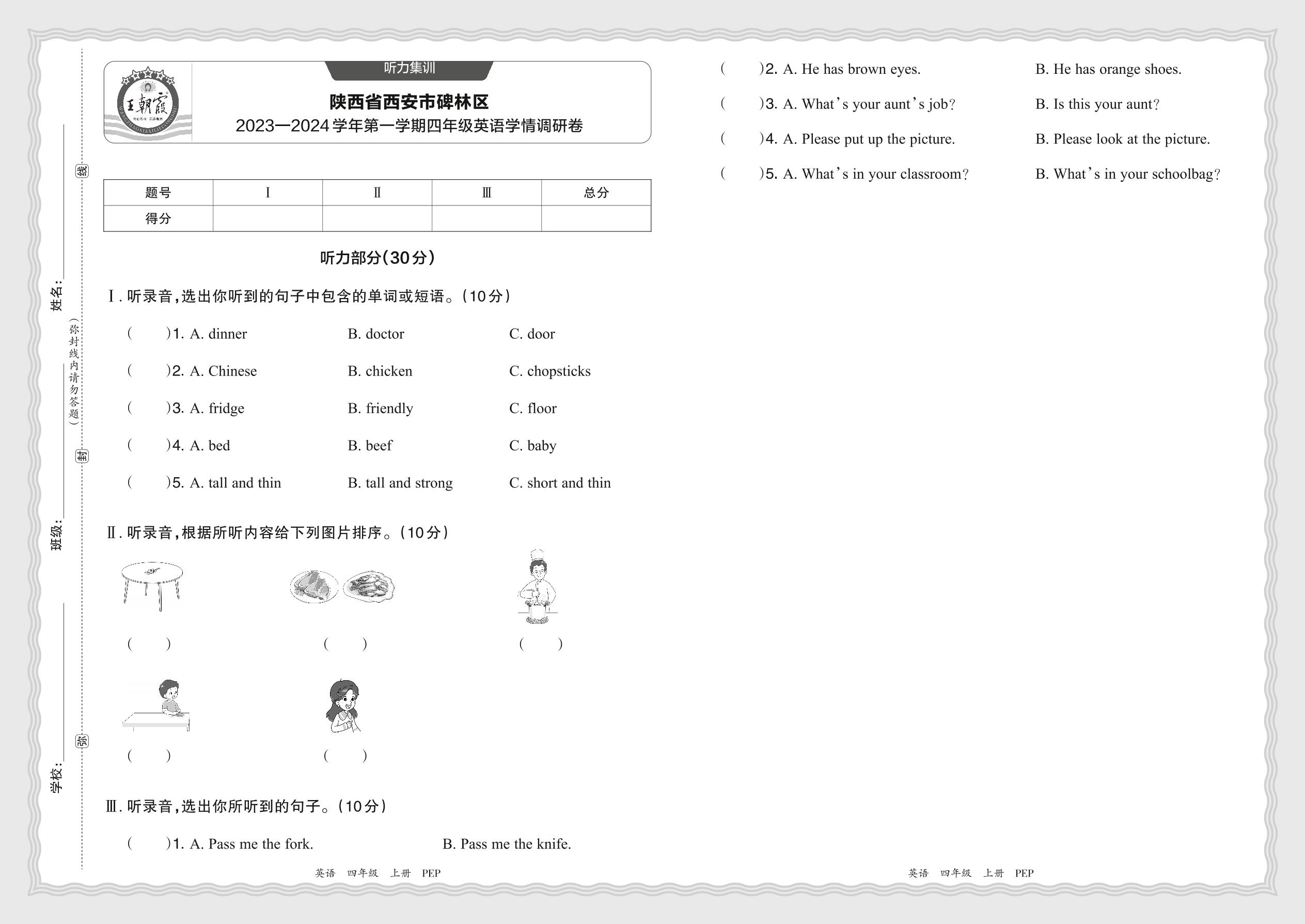 【听力集训】陕西省西安市碑林区2023—2024学年第一学期四年级英语学情调研卷(人教PEP版)