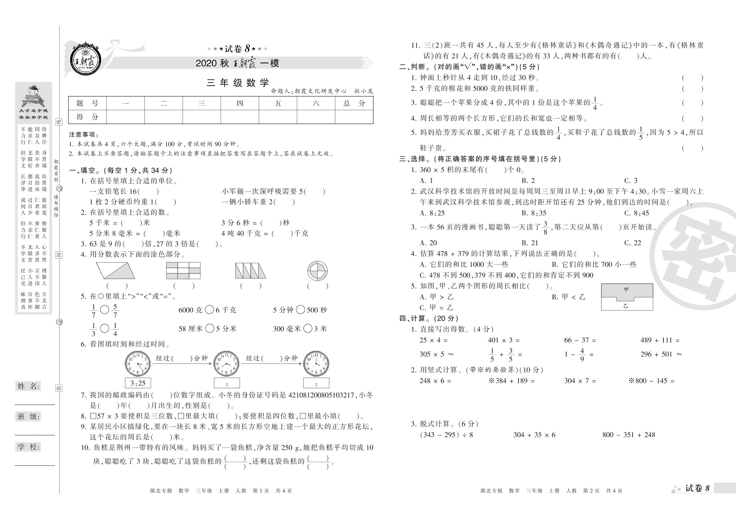 王朝霞期末模拟卷三年级上册数学(人教版)_R21080492031【8】