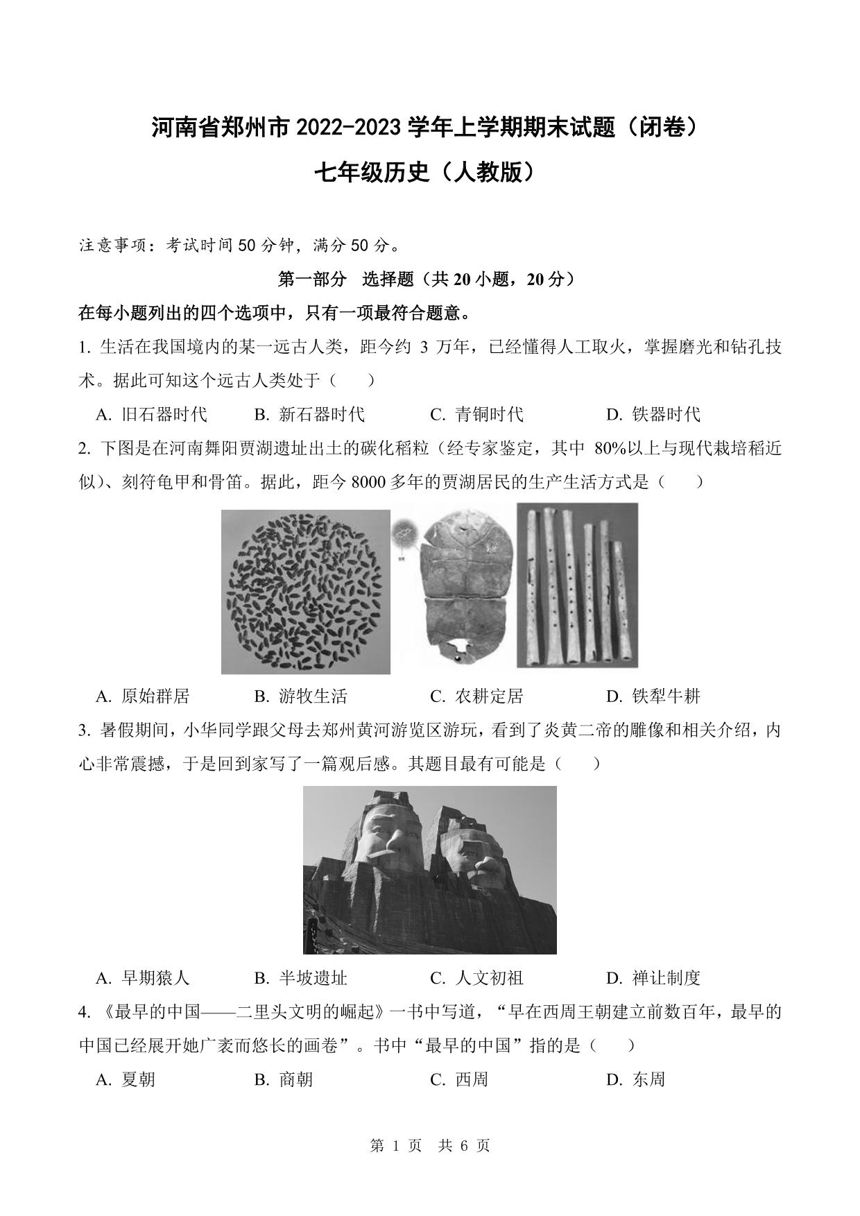 河南省郑州市2022-2023学年上学期期末试题七年级历史(人教版)