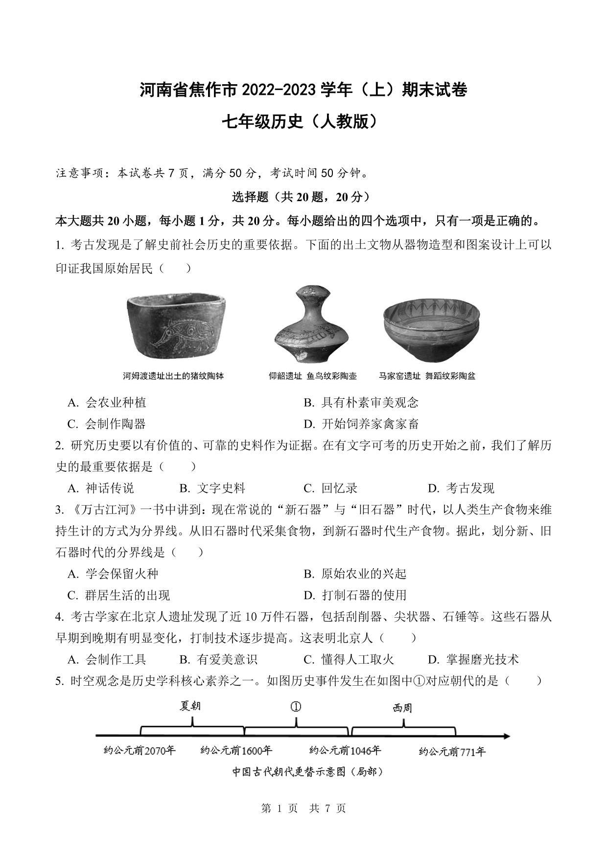 河南省焦作市2022-2023学年(上)期末试卷七年级历史(人教版)