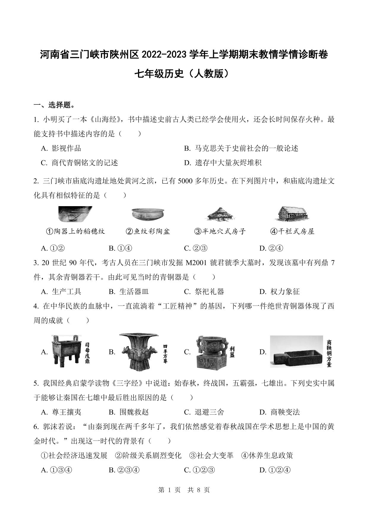 河南省三门峡市陕州区2022-2023学年上学期期末教情学情诊断卷七年级历史(人教版)