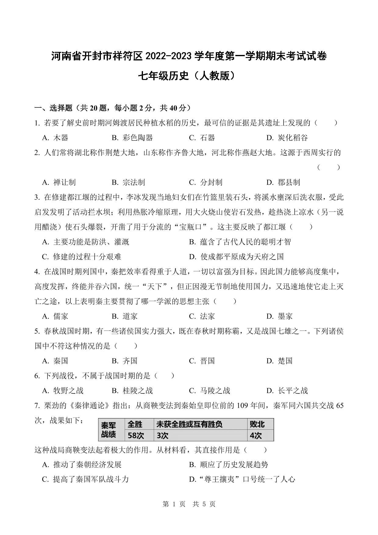 河南省开封市祥符区2022-2023学年度第一学期期末考试试卷七年级历史(人教版)