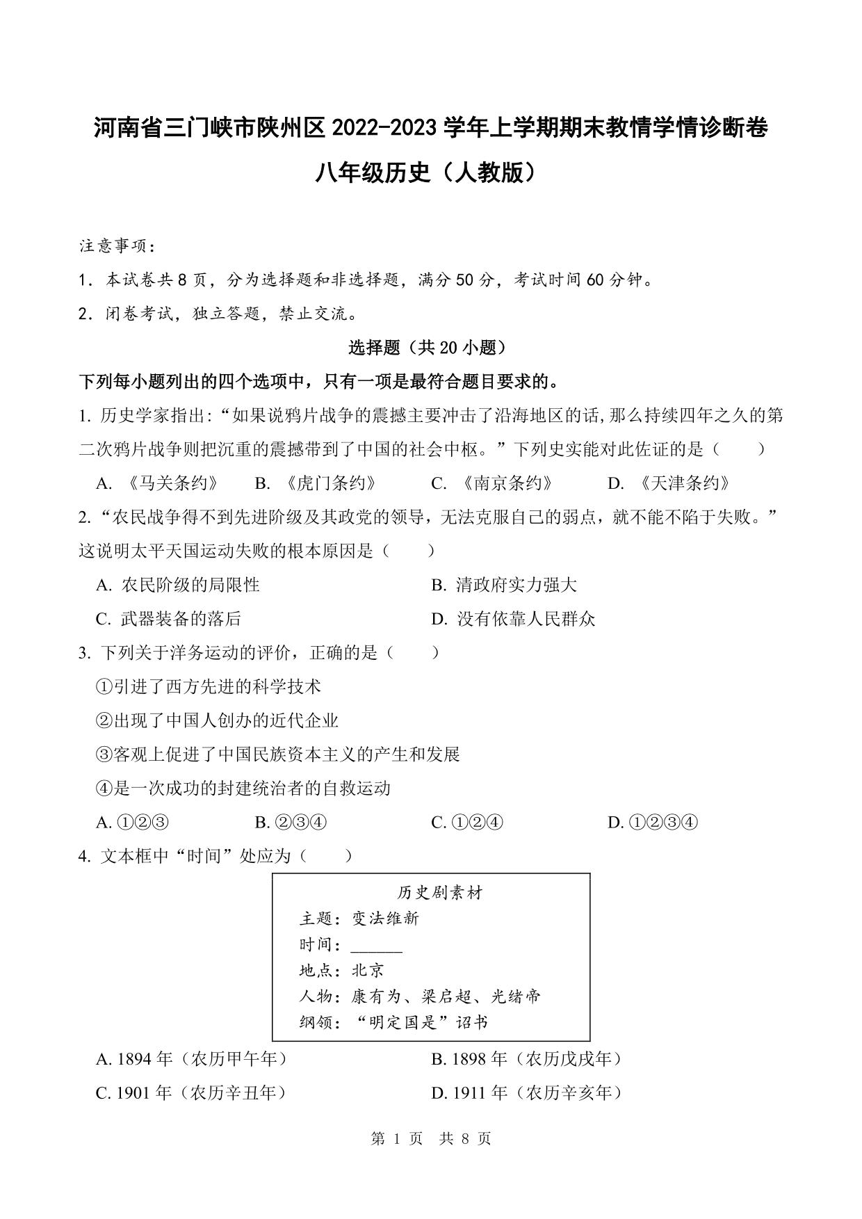 河南省三门峡市陕州区2022-2023学年上学期期末教情学情诊断卷八年级历史(人教版)