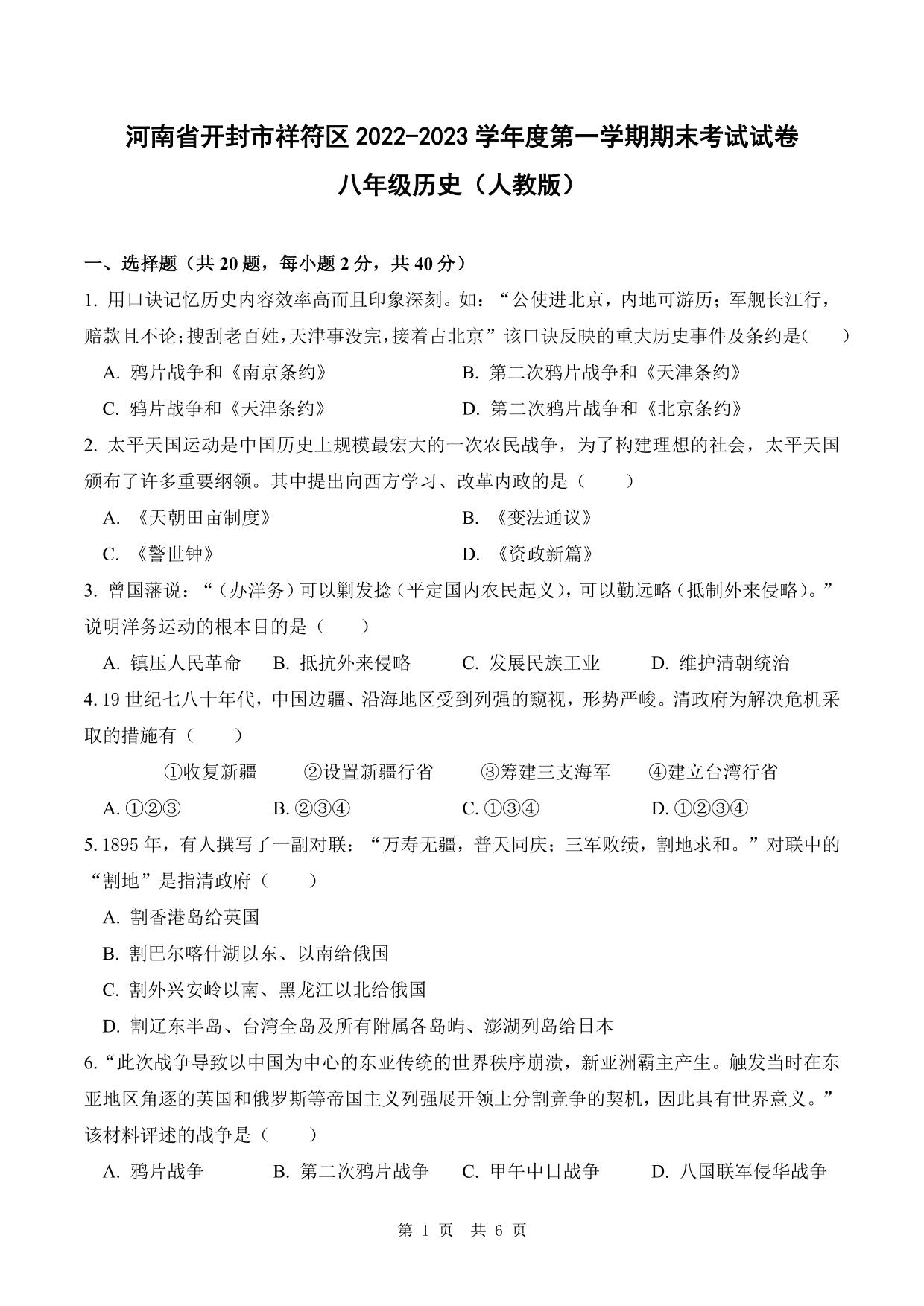河南省开封市祥符区2022-2023学年度第一学期期末考试试卷八年级历史(人教版)