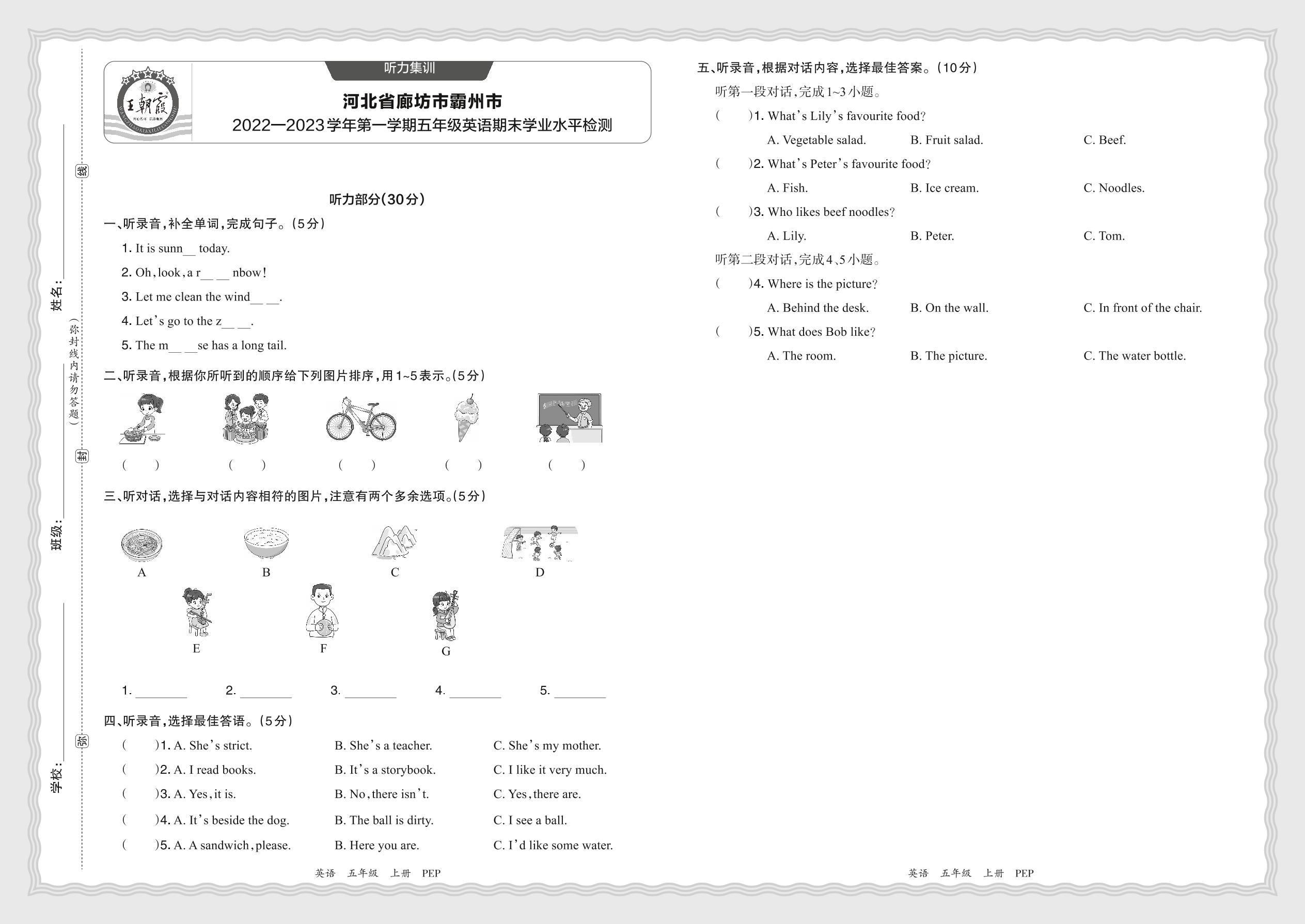 【听力集训】河北省廊坊市霸州市2022—2023学年第一学期五年级英语期末学业水平检测(人教PEP版)