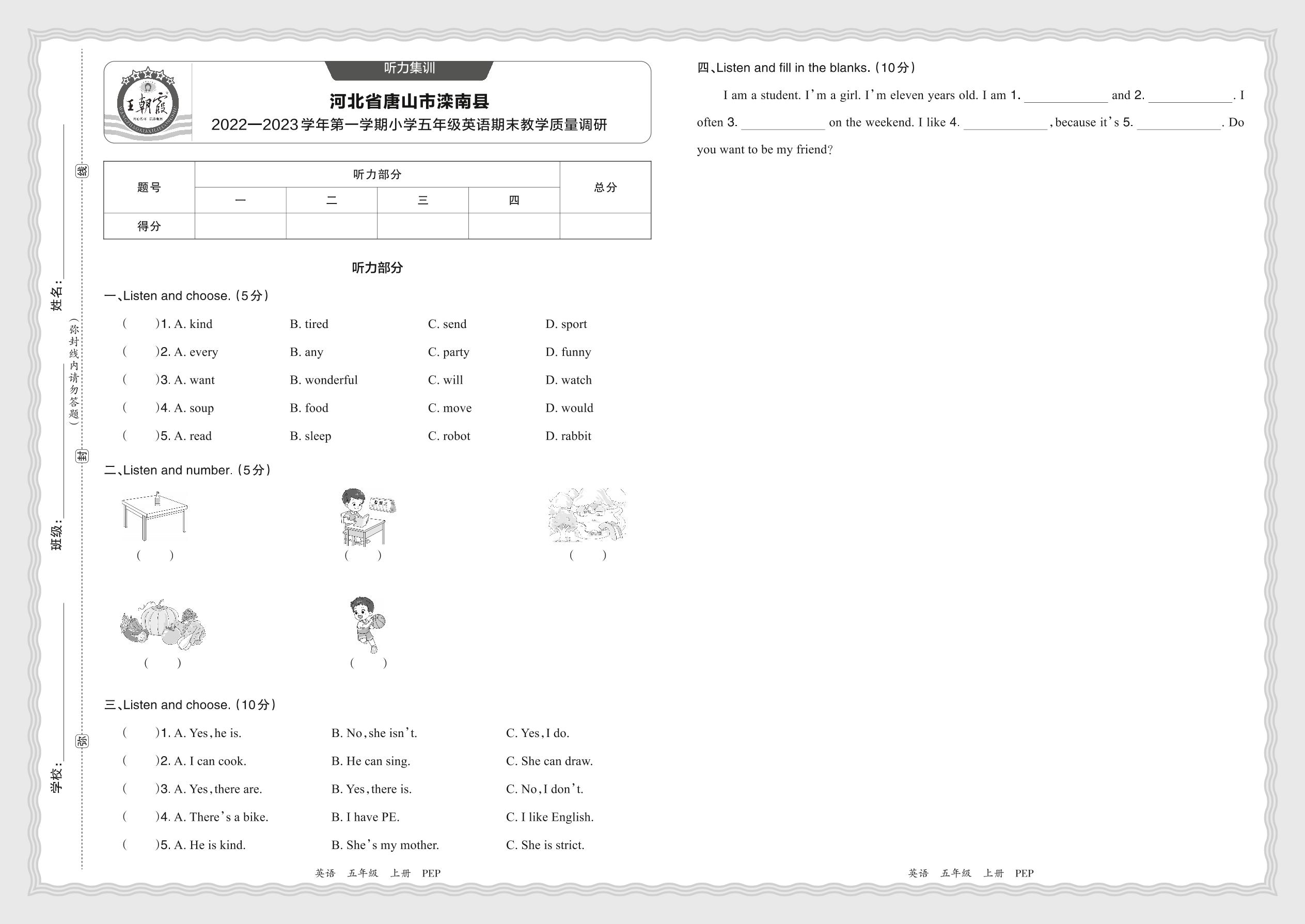 【听力集训】河北省唐山市滦南县2022—2023学年第一学期小学五年级英语期末教学质量调研(人教PEP版)