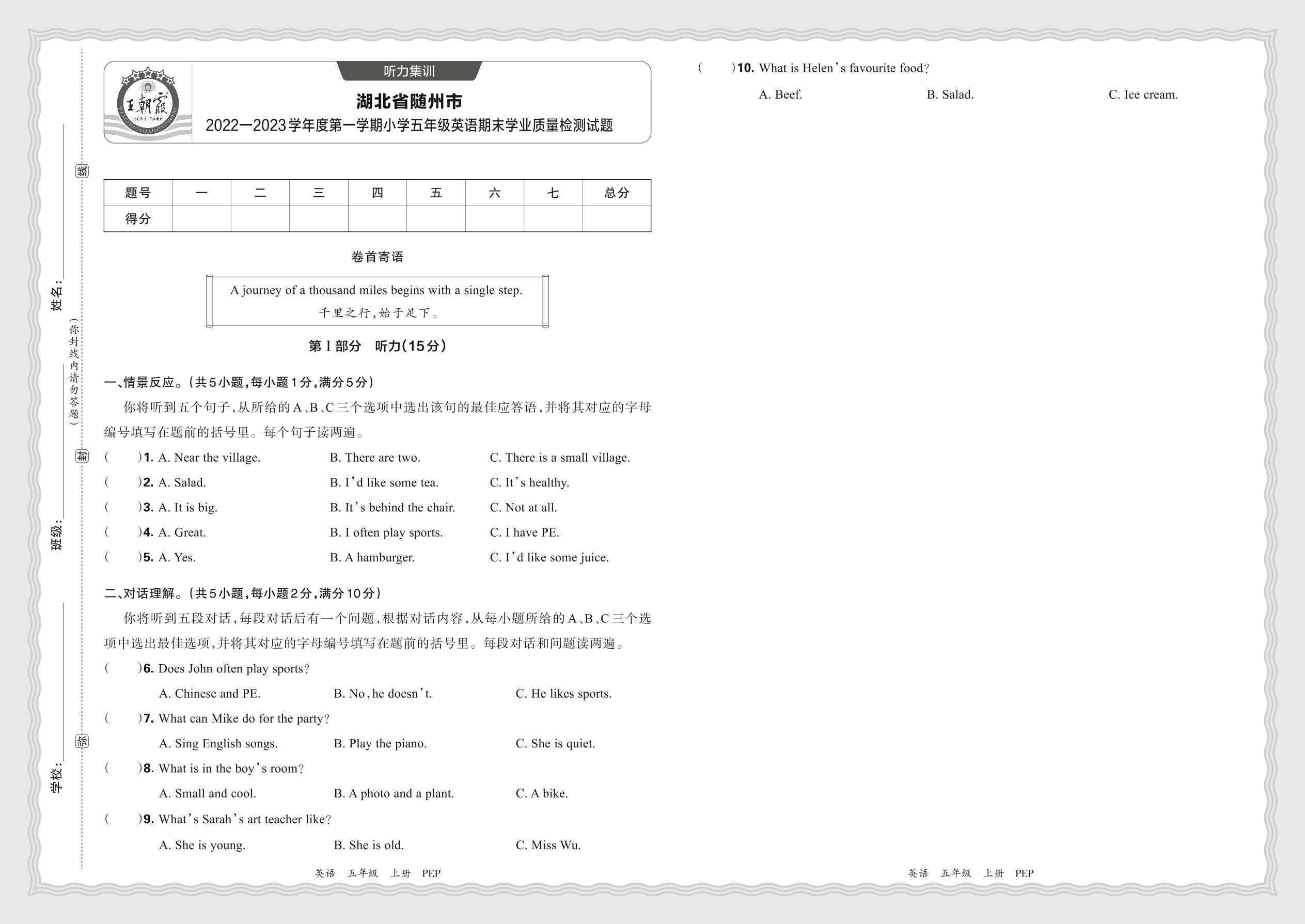 【听力集训】湖北省随州市2022—2023学年度第一学期小学五年级英语期末学业质量检测(人教PEP版)