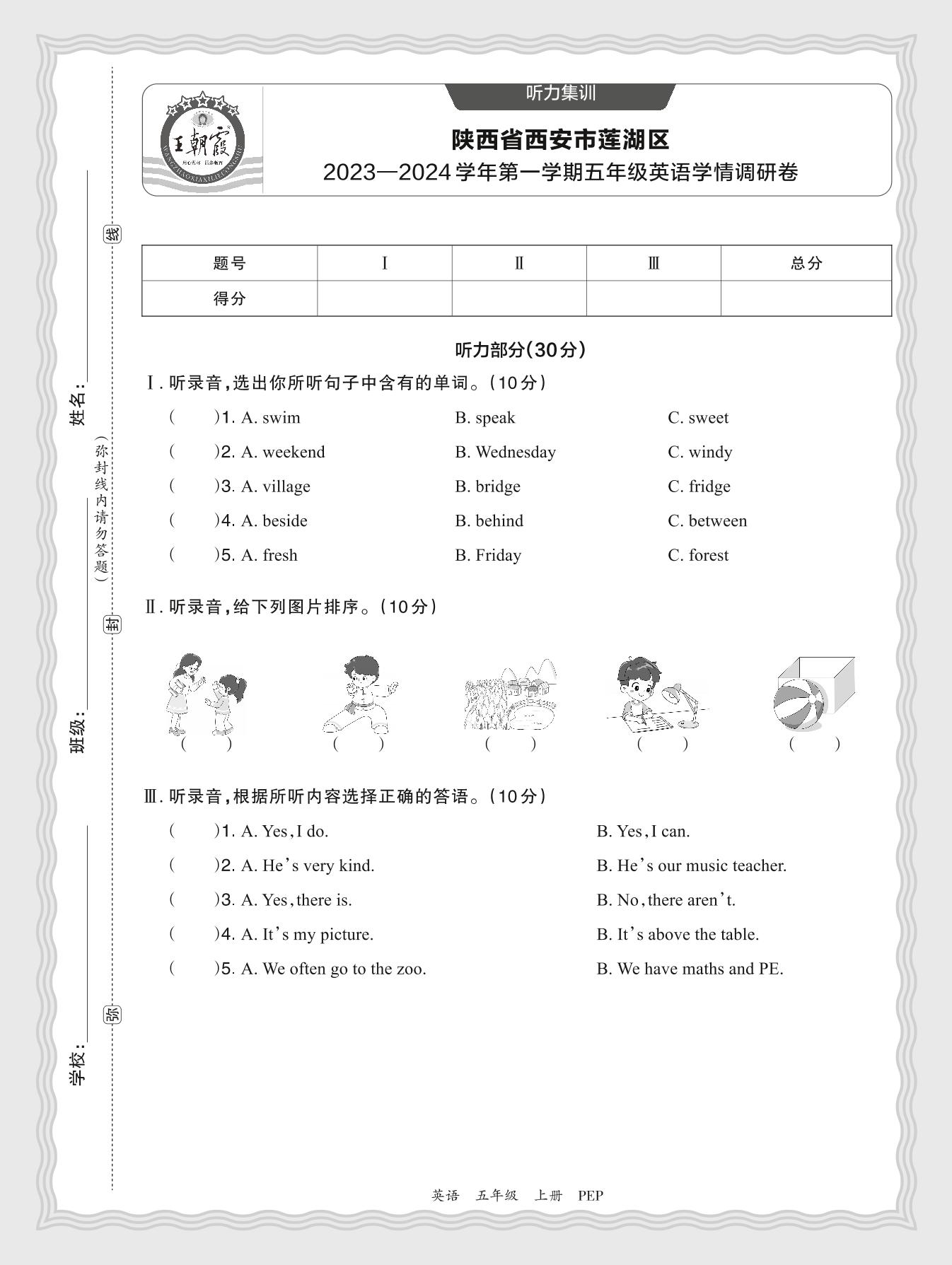 【听力集训】陕西省西安市莲湖区2023—2024学年第一学期五年级英语学情调研卷(人教PEP版)
