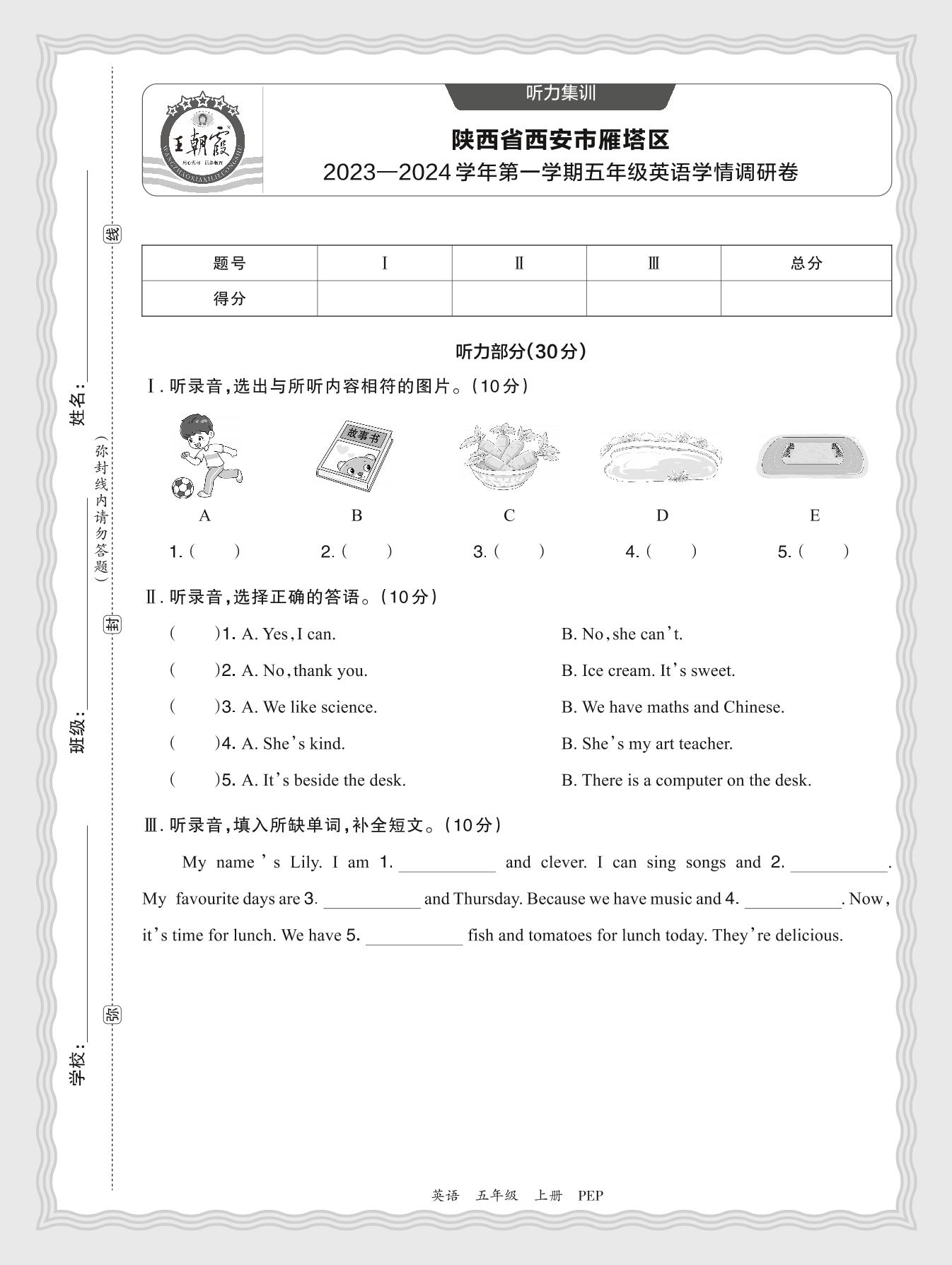 【听力集训】陕西省西安市雁塔区2023—2024学年第一学期五年级英语学情调研卷(人教PEP版)
