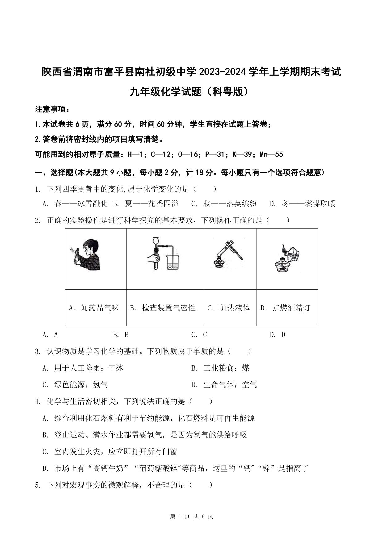 陕西省渭南市富平县南社初级中学2023—2024学年九年级上学期期末考试化学试题(科粤版)