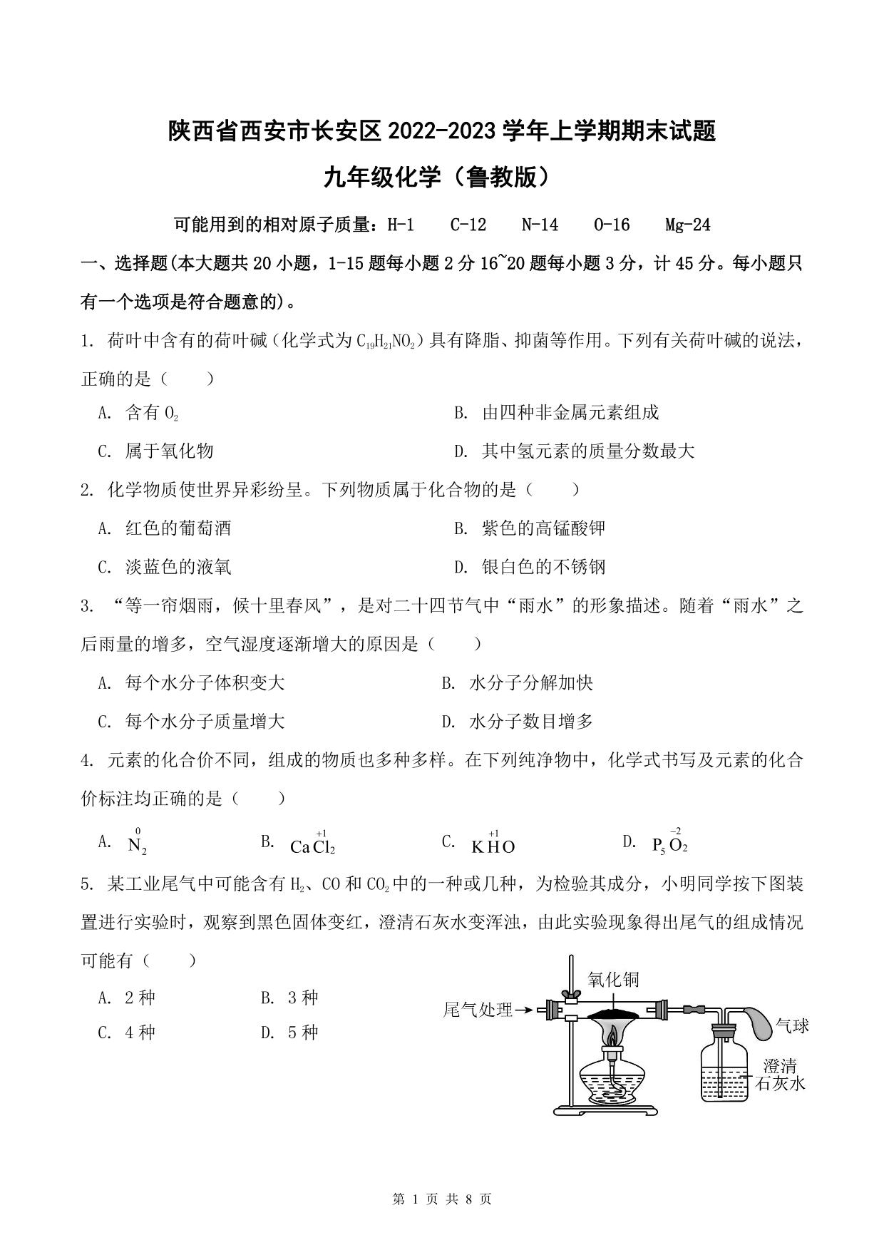 陕西省西安市长安区2022—2023学年上学期期末试题九年级化学(鲁教版)