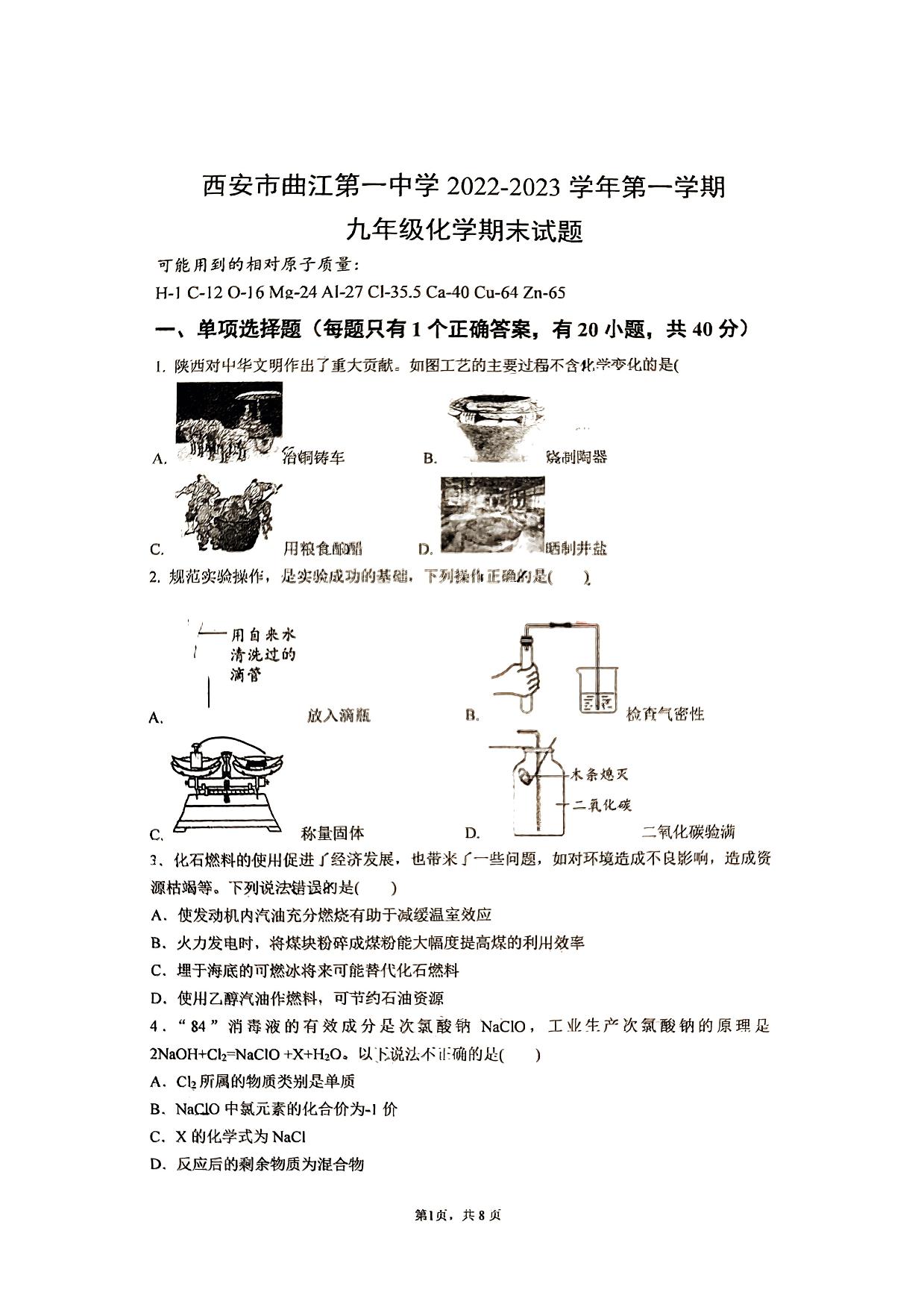 陕西省西安市曲江第一中学2022—2023学年上学期期末试题九年级化学(科粤版)