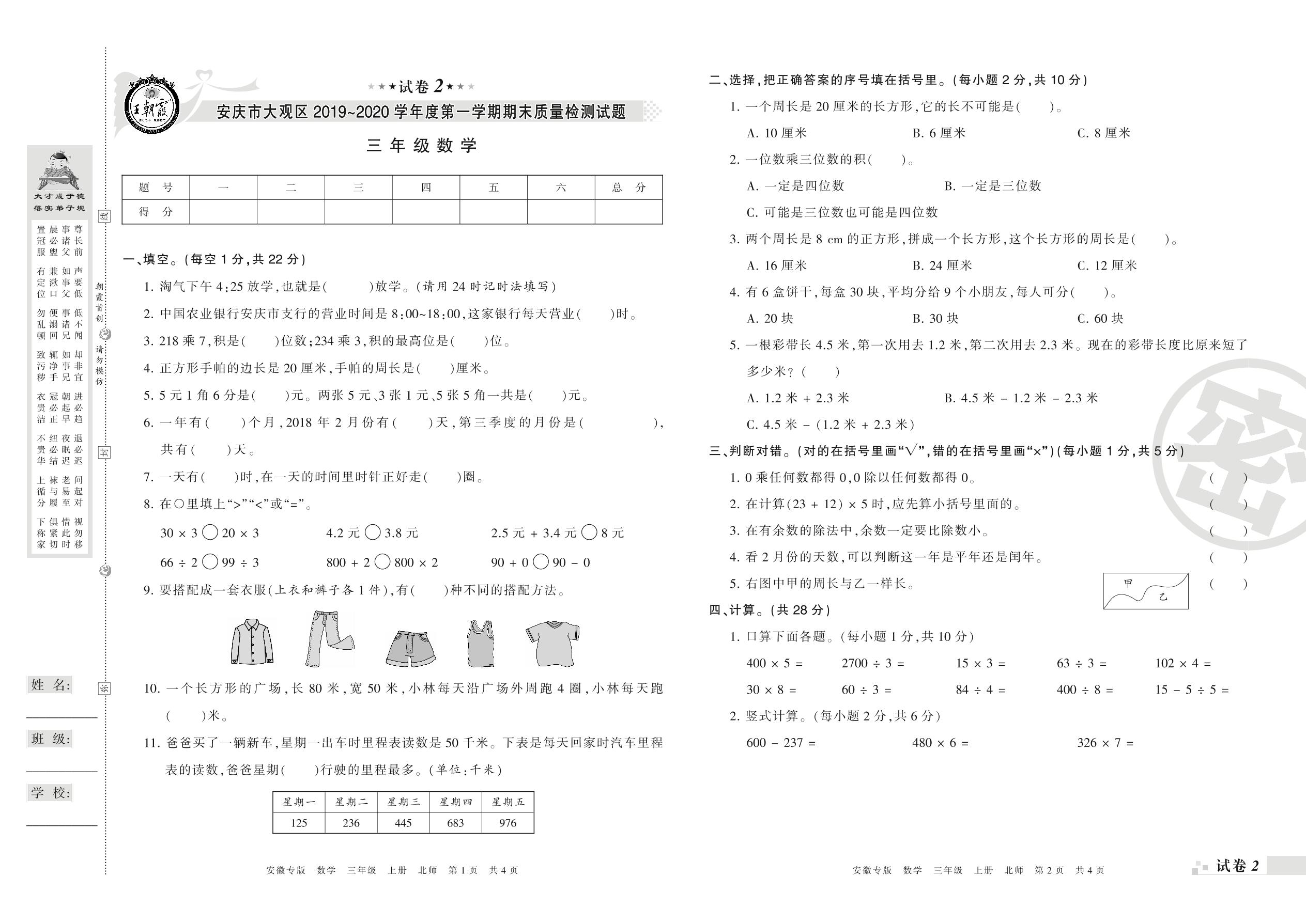 2019-2020学年第一学期安庆市大观区三年级数学试卷(北师版)【2】