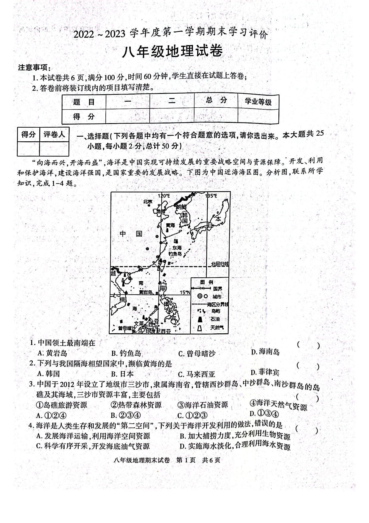 陕西省西安市长安区2022-2023学年上学期期末试卷八年级地理(湘教版)