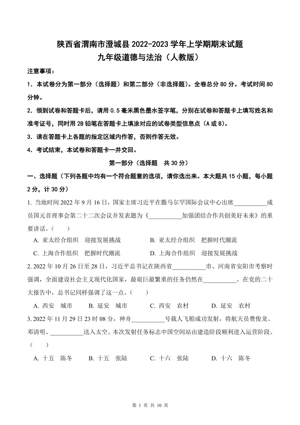 陕西省渭南市澄城县2022—2023学年上学期期末试题九年级道德与法治(人教版)