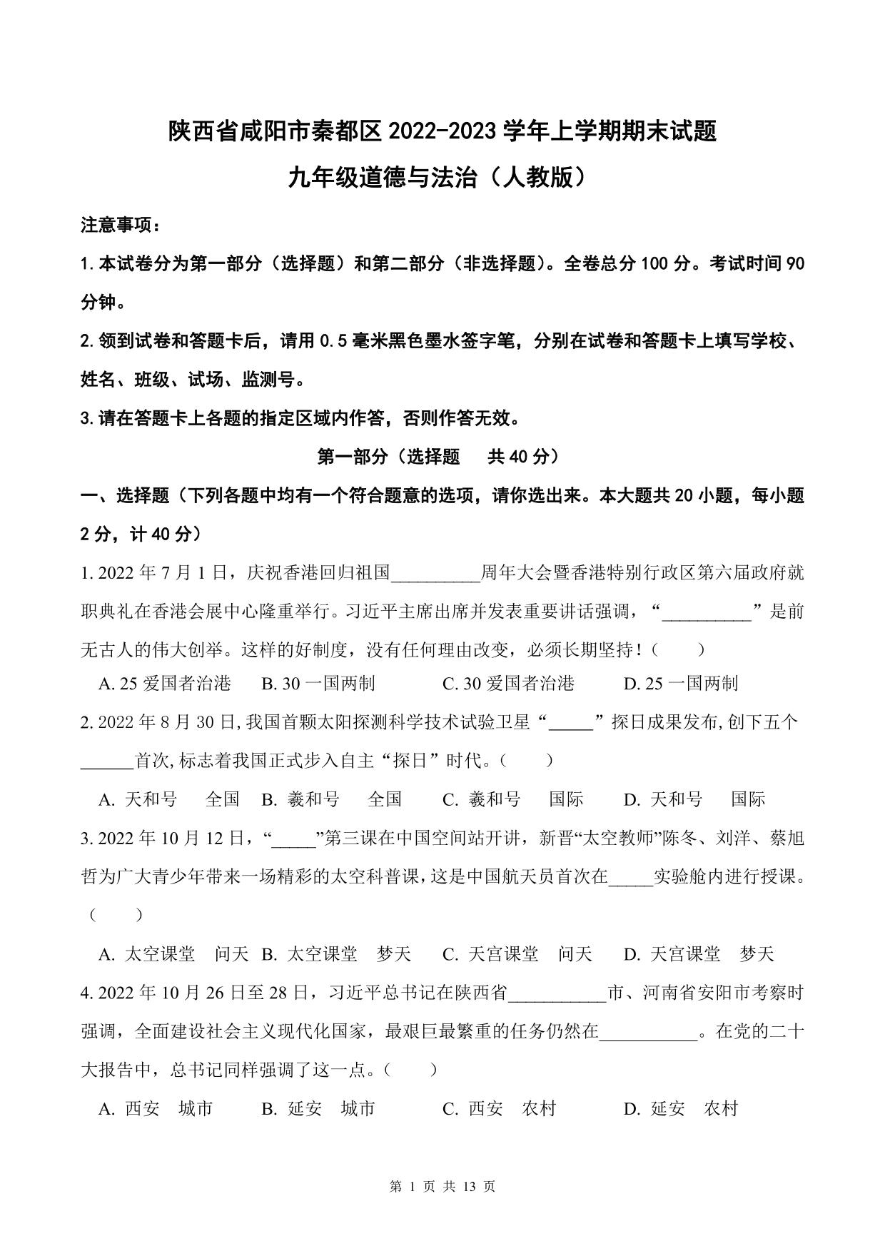 陕西省咸阳市秦都区2022—2023学年上学期期末试题九年级道德与法治(人教版)