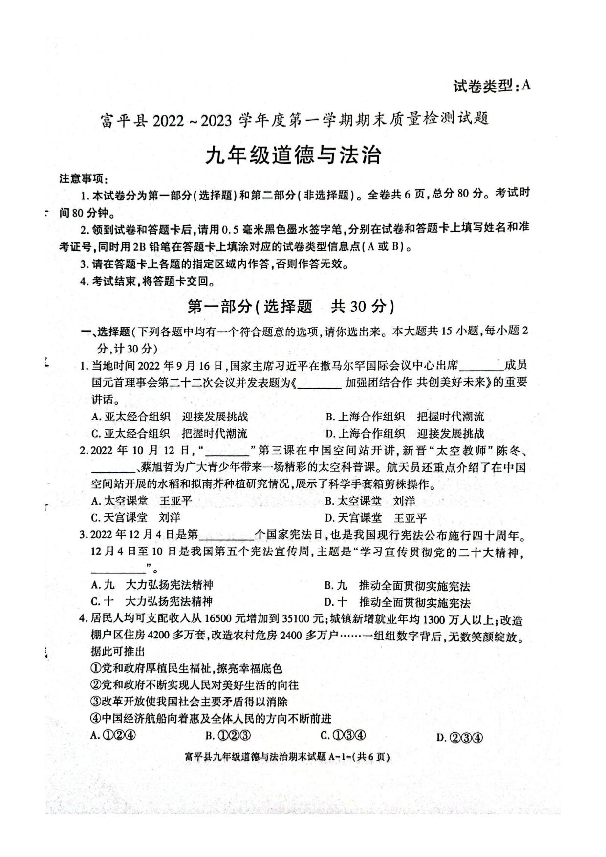 陕西省渭南市富平县2022—2023学年上学期期末考试试题九年级道德与法治(人教版)