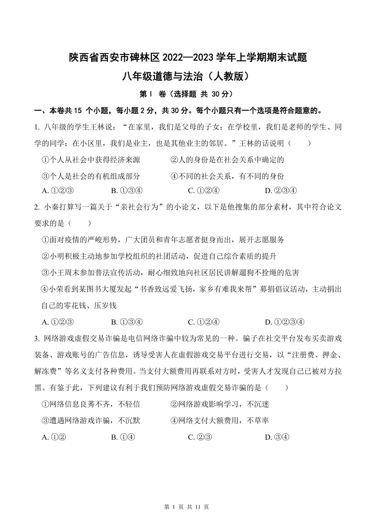 陕西省西安市碑林区2022—2023学年上学期期末试题八年级道德与法治(人教版)