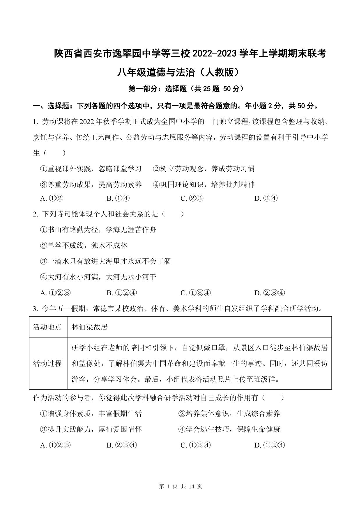 陕西省西安市逸翠园中学等三校2022—2023学年上学期期末联考八年级道德与法治(人教版)